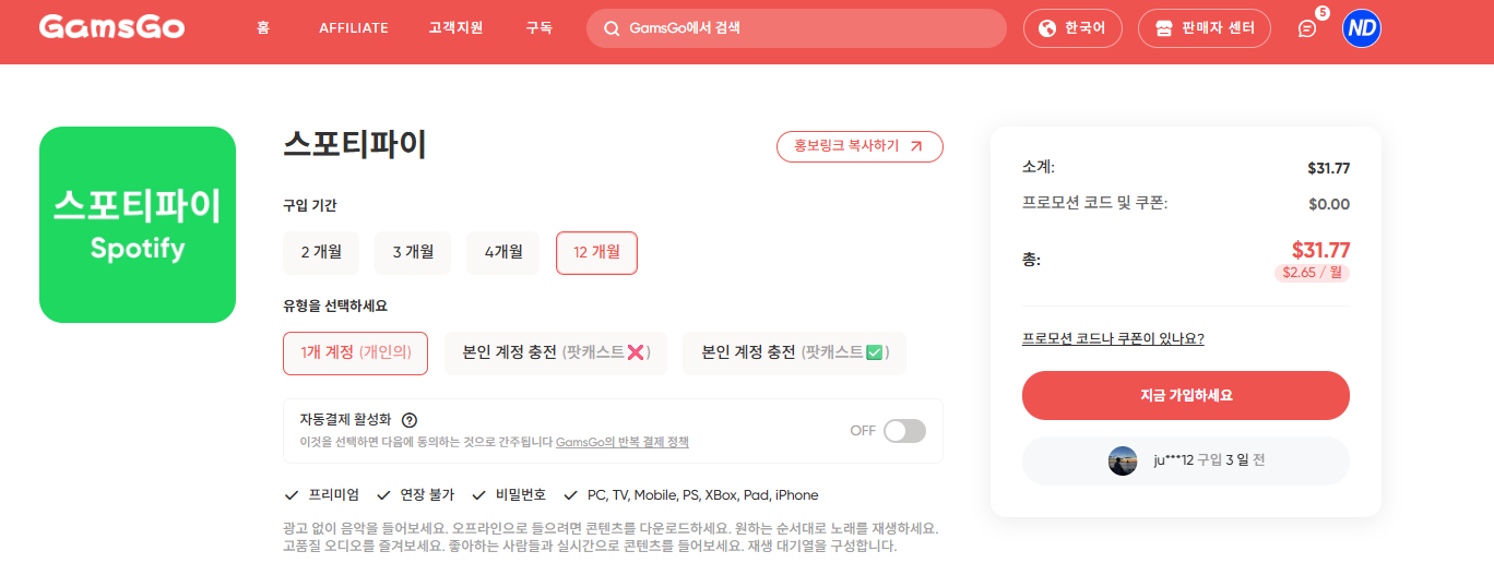 GamsGo 가입 → 스포티파이 선택 → 12개월 구독 선택