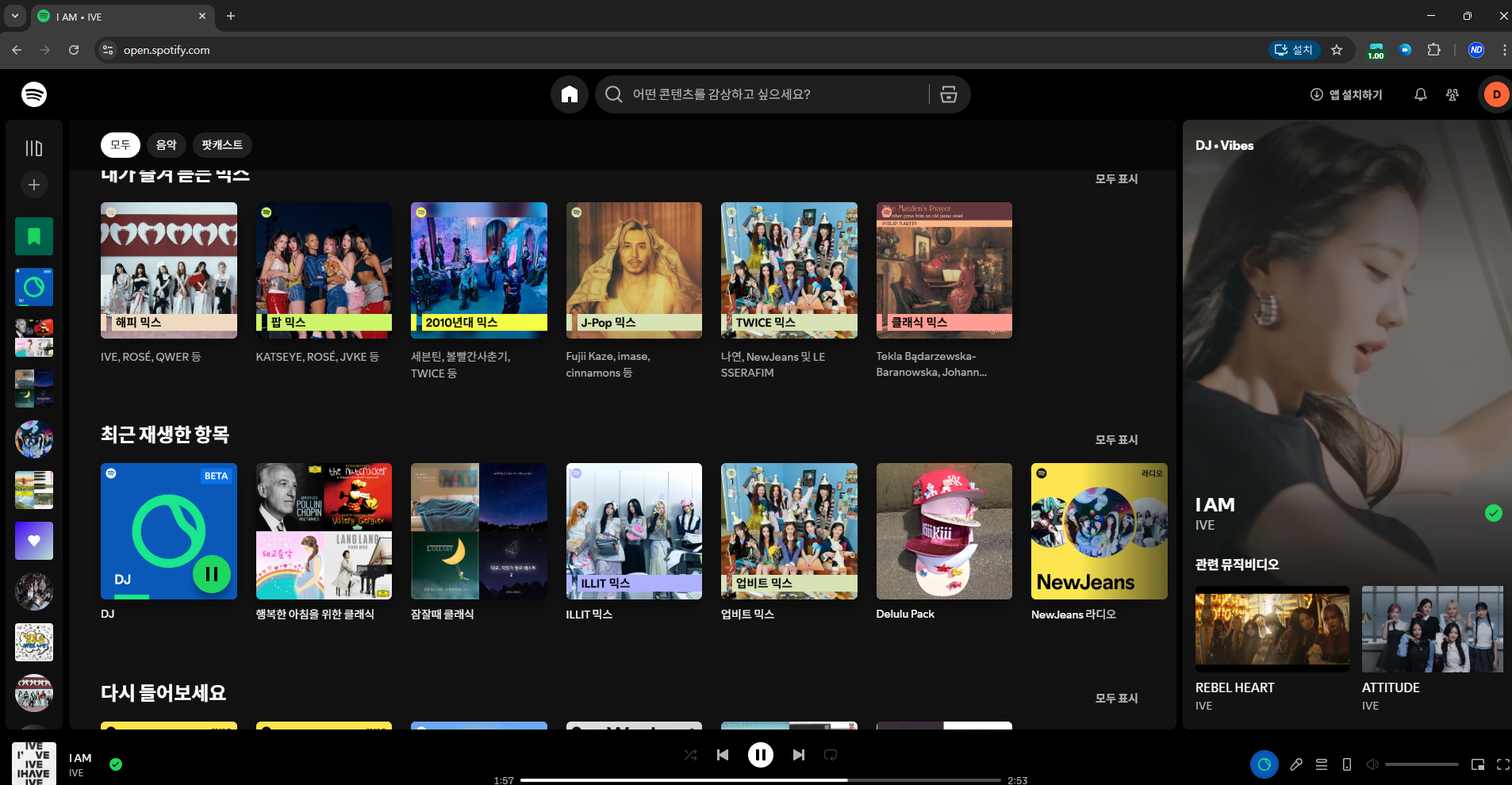 즉, 내가 원하는 아이브의 노래가 언제 나올지 알 수 없으며, 운이 좋아야 그 노래를 들을 수 있는 구조입니다. 아이브의 음악 자체는 라이브러리에 분명히 존재하지만, 이를 사용자가 직접 통제할 수 없다는 점은 팬들에게는 매우 치명적인 단점으로 다가옵니다.
