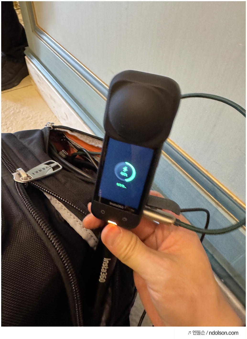 배터리 효율도 칭찬하고 싶습니다. 1300mAh 용량의 배터리는 1080p 기준 최대 166분이라는 긴 연속 촬영 시간을 제공합니다. 5시간 동안 해리포터 스튜디오를 관람하며 틈틈이 켰다 껐다를 반복했음에도 넉넉했습니다. 더 놀라운 것은 충전 속도입니다. PD 고속 충전을 지원하여 단 16분 만에 80%까지 충전되고 32분이면 완충됩니다. 보조배터리에 잠깐 꽂아두고 밥을 먹고 나오면 100%가 되어 있는 괴물 같은 충전 속도 덕분에 여행 내내 배터리 스트레스가 제로였습니다.