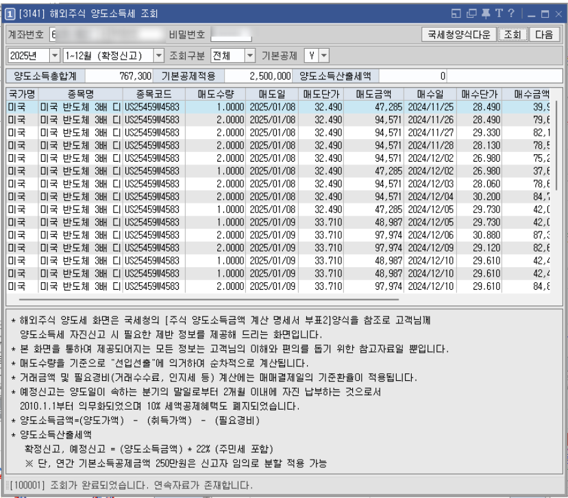 화면 상단의 기준 연도를 과세 연도로 맞춰놓고 조회 버튼을 누르면, 작년 한 해 동안 거래했던 수많은 종목의 내역이 쭉 펼쳐집니다. 가장 하단에 위치한 양도소득금액 란의 숫자가 250만 원을 넘는지 확인하는 것이 핵심입니다.
