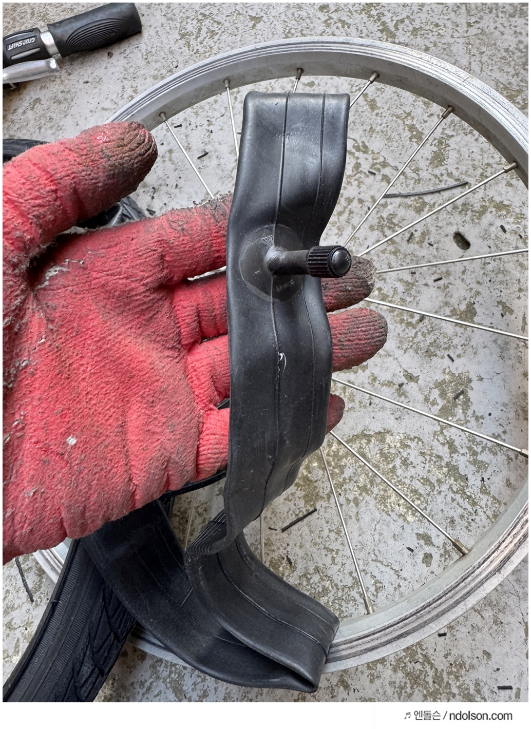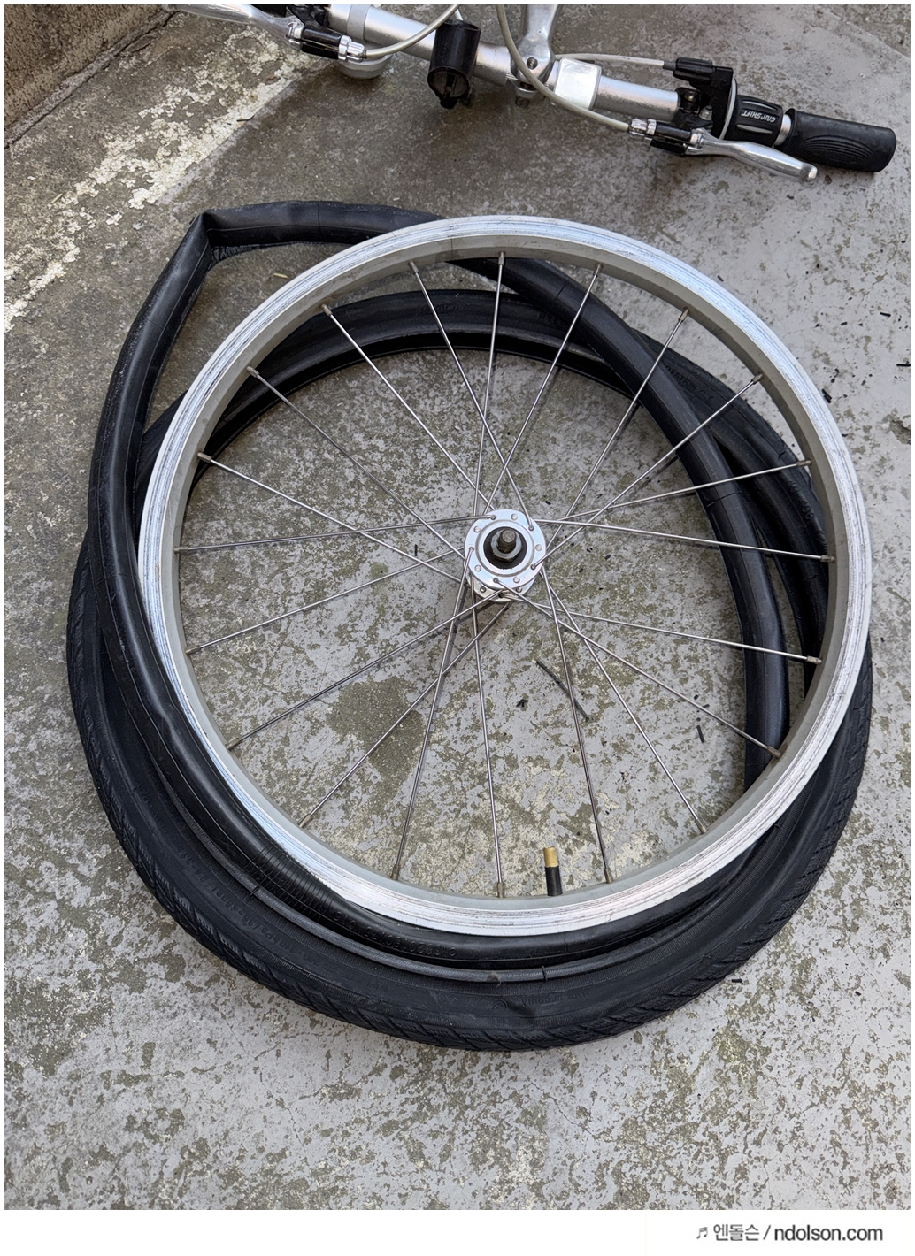 날씨가 좋아져서 오랜만에 자전거를 타볼까 하고 꺼냈는데... 아뿔싸, 상태가 말이 아니었습니다. 뒷바퀴 타이어는 세월의 풍파를 이기지 못하고 림에서 완전히 벗겨진 채 쩍쩍 갈라져 있었고, 튜브는 이미 회생 불가능한 상태였죠.