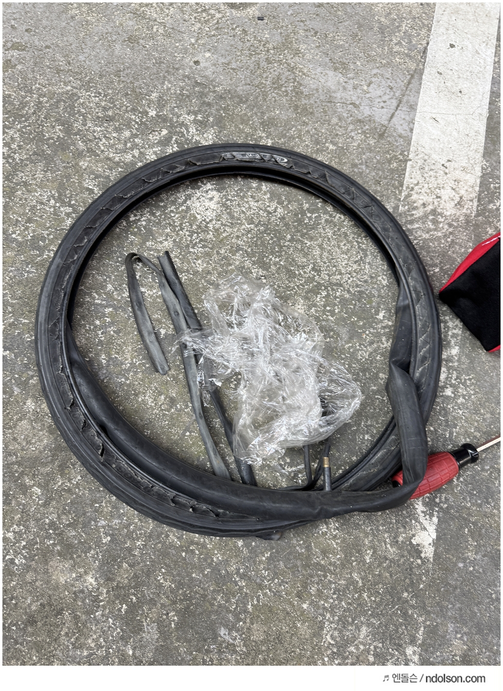 부품이 도착하고, 주말을 맞아 본격적인 정비에 들어갔습니다. 준비물은 타이어 주걱(레버) 2개와 자전거 펌프면 충분합니다!