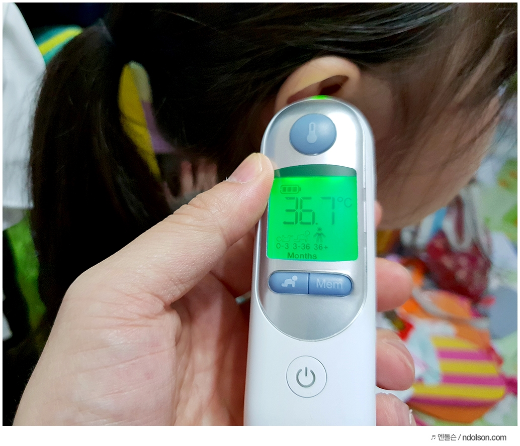 건전지도 같이 들어 있어서 바로 넣고 사용했습니다. 브라운체온계의 좋은점은 초록색, 노란색, 빨강색의 색상으로 온도를 표시합니다. 초록색은 정상! 온도를 계속 보기 힘든데, 이렇게 보니 더 편하겠죠?