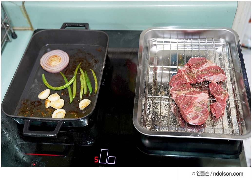 고기는 무쇠 주물팬에 구워야 맛있습니다. 높은 온도에 빨리 익혀 고기의 육즙은 살아 있고, 제대로 된 굽기가 나오는데요. 이런 무쇠 주물팬은 세로로 길어서 일반 가스레인지에서는 테두리가 열을 받지 못할 수 있습니다.