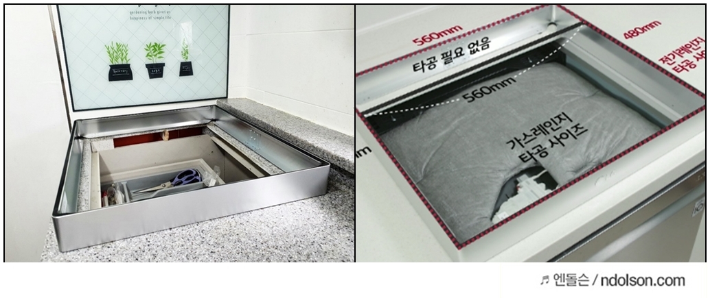 빌트인 가스레인지는 대부분 타공 사이즈가 560*430 이고, LG 전기레인지 빌트인으로 설치하려면 560*480가 필요해서 5cm 타공을 해야 하다는 것입니다. 하지만 6.5cm 빌트인 케이스를 쓰면 타공 없이 설치가 가능합니다.