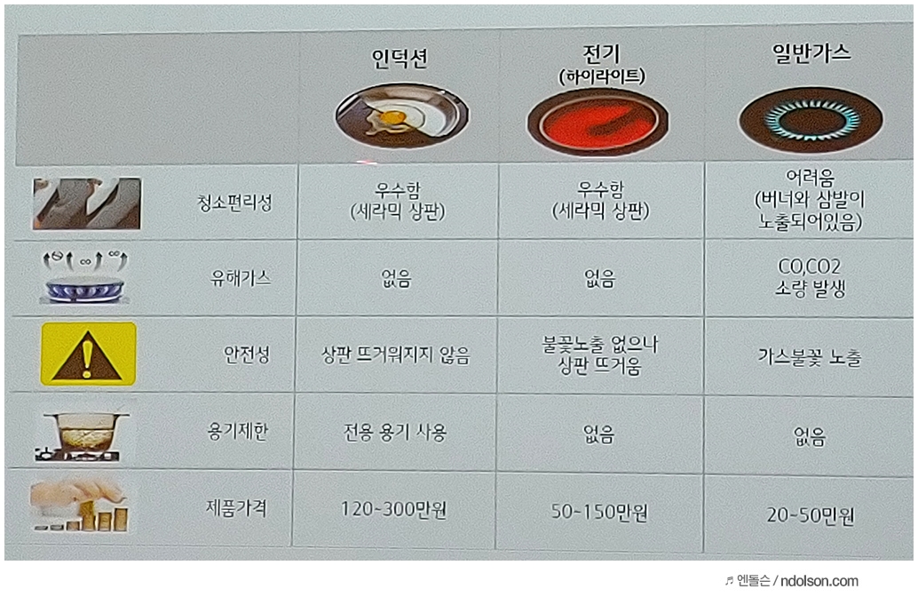 인덕션, 하이라이트, 일반가스 레인지를 보면 장점/단점이 있습니다. 보통 가스불에 익숙하여 써왔는데, 알고 보면 투입 대비 이용 효율은 40% 내외로 떨어진다고 합니다. 또 불완전 연소될 가능성도 있어 실내에서 사용 시 좋지 못하다고 합니다.