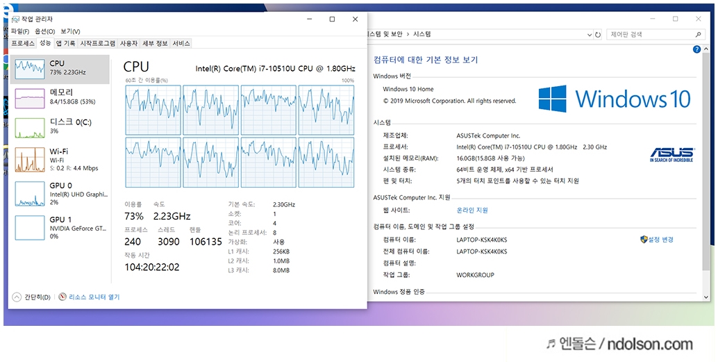 필자는 노트북을 업무 및 개인 취미 영상 편집 등의 다양한 용도로 10년 넘게 사용해온 유저입니다. 노트북을 끼고 살아온 입장에서 에이수스 노트북은 가장 콤팩트하면서도 인텔 10세대 CPU 코어™ i7 프로세서(i7-10510U)를 탑재 노트북이면서 혁신적인 ScreenPadTM 2.0를 탑재하고 있습니다.