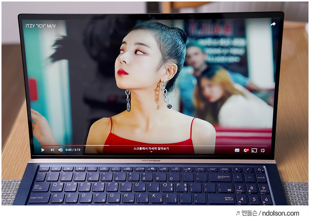 뉴 젠북 ASUS New 젠북 15 (UX534)의 화면은 FHD(UHD 모델로 선택 가능) 굉장히 선명한 화면을 느낄 수 있습니다. 하지만 안티글레어 (저반사) 액정이 아닌 글레어 액정이라 형광 등 밑에서는 다소 비칠 수도 있습니다.
