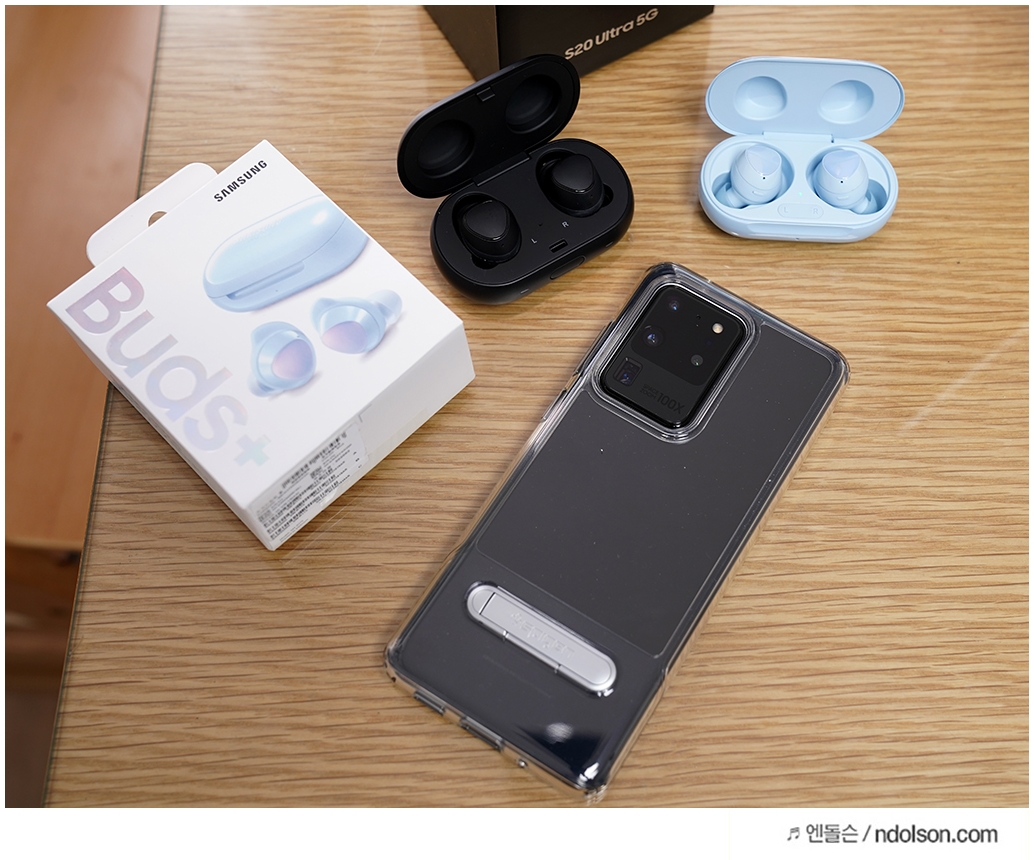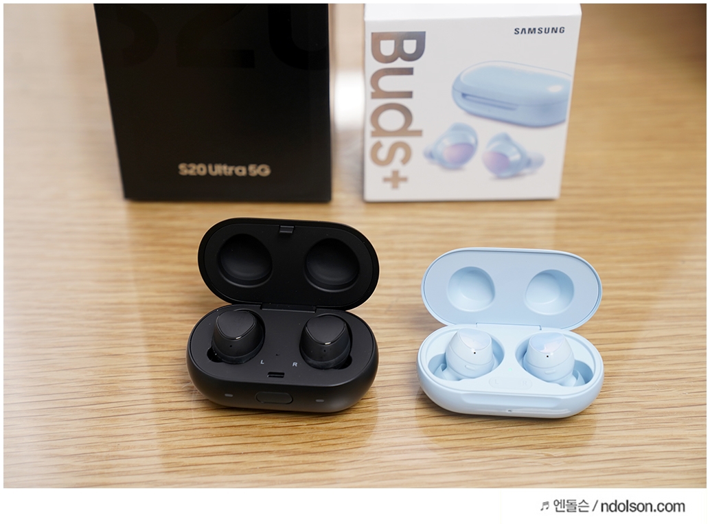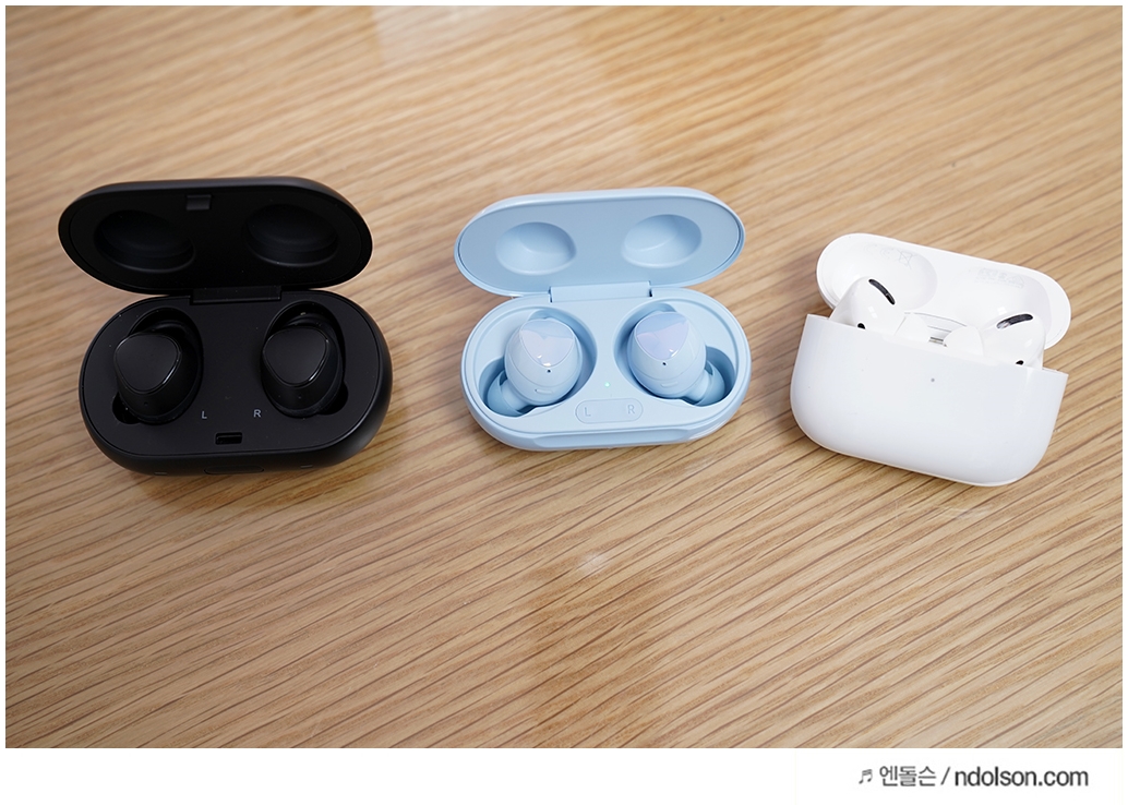 왼쪽부터 갤럭시 버즈, 갤럭시 버즈 플러스, 에어팟 프로 순입니다. 이번에 갤럭시 버즈 플러스에 노이즈캔슬링 기능이 탑재 안된 것이 아쉽지만 착용감과 갤럭시S20 울트라 스마트폰과의 궁합은 엄청나게 좋았습니다.