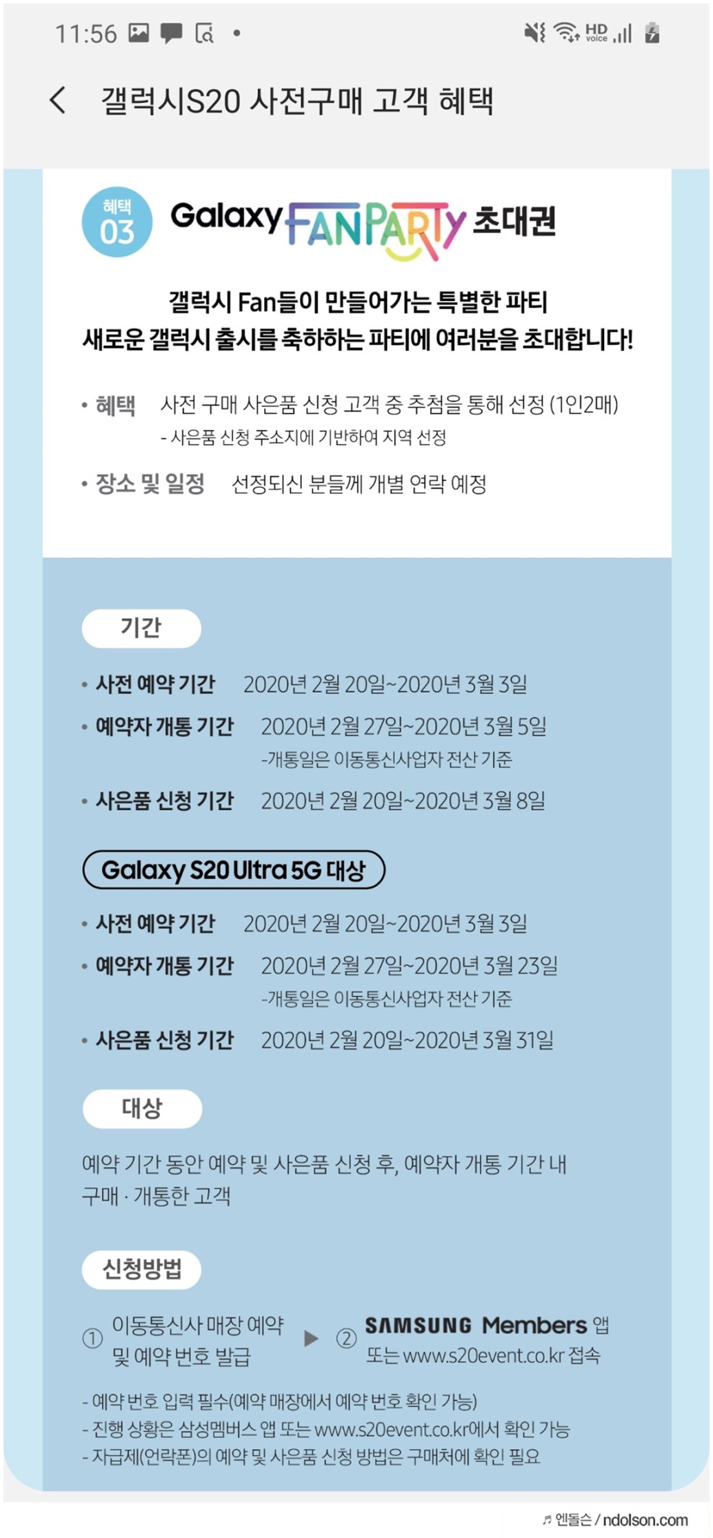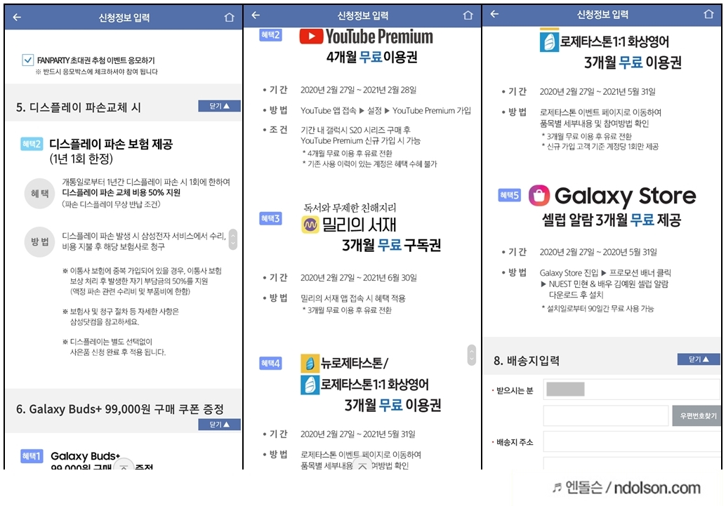 갤럭시 S20 구매자 사은품 수령은 삼성 멤버스 앱에 접속하여 신청하시면 됩니다.