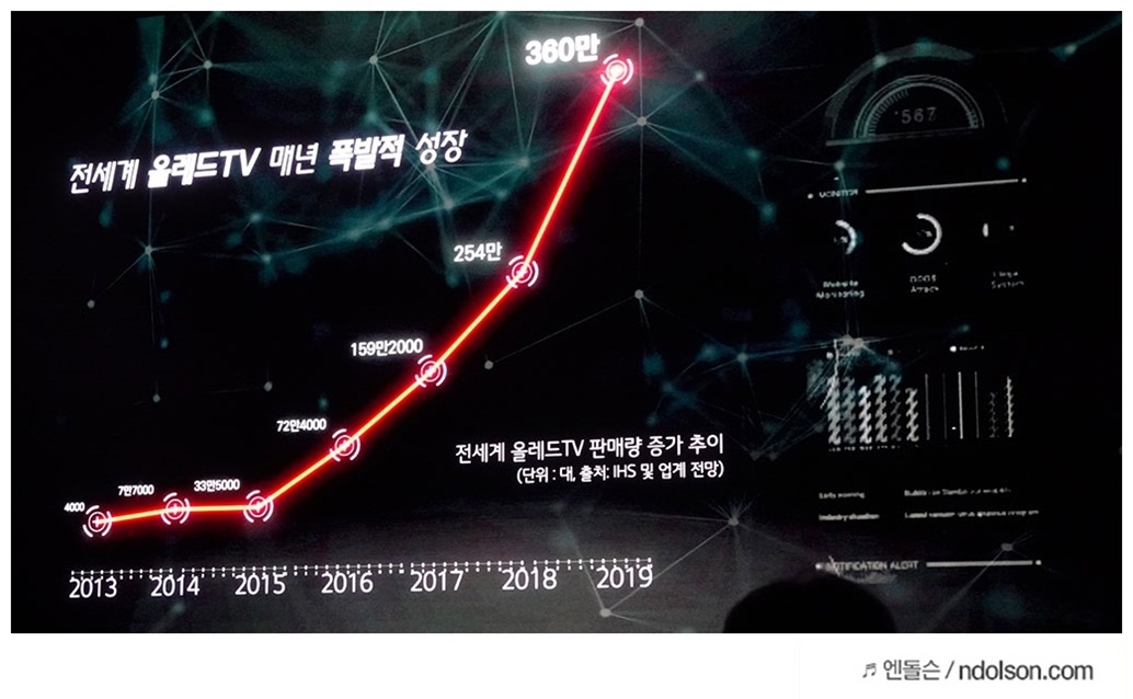 반면 올레드 TV는 전혀 다른 패러다임의 제품입니다. 이 백라이트가 필요하지 않은 자발광 방식의 TV이기 때문이죠. 기존 TV들과 현저히 다른 세대를 형성하며 점점 시장 규모를 늘려가고 있는데요. 놀랍게도 이 올레드 TV 또한 LG 전자가 세계 최초로 선보였습니다. 그리고 여기서 그치지 않고 세계최초 웰페이퍼 디자인의 올레드 TV와 롤러블 TV, 리얼 8K 올레드 TV까지 모두 LG 전자가 앞장선 TV 진화의 역사라고 할 수 있습니다.