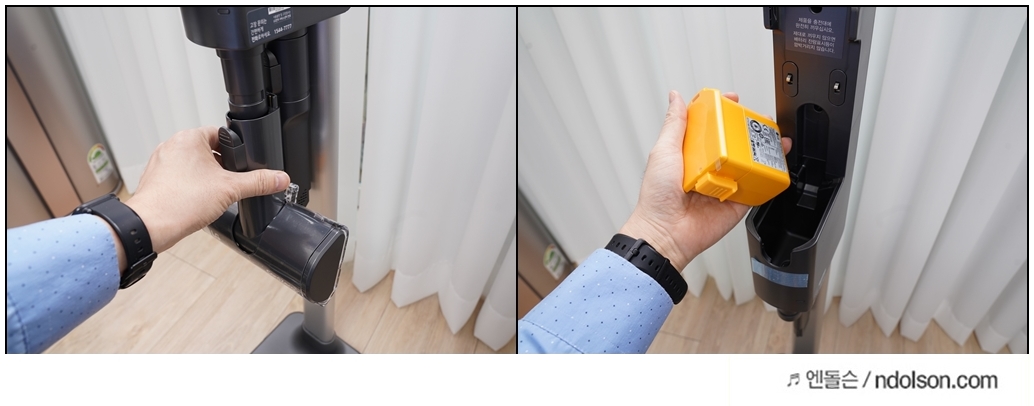 2개의 대용량 배터리를 동시에 충전이 가능합니다. 하나는 스탠드에 끼워두고, 청소기에 끼워 걸어두면 동시에 배터리 충전이 가능합니다.