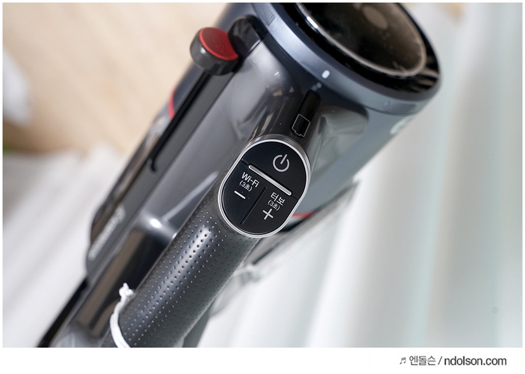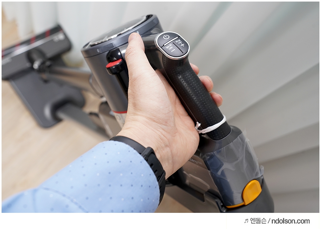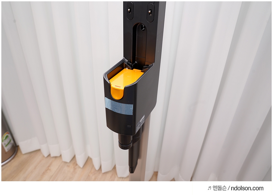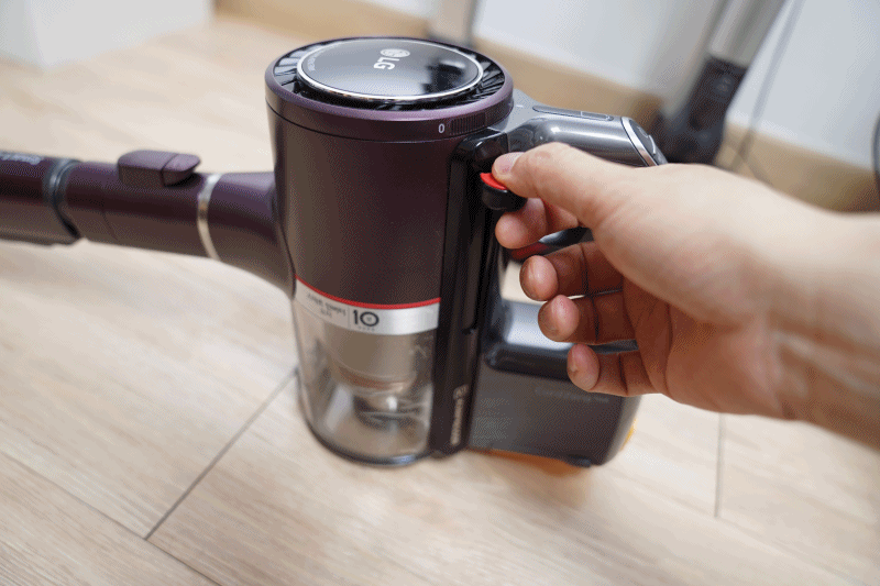 이제 먼지통을 비울 때는 손잡이 옆에 레버를 누르면 먼지통의 내부의 필터 주변까지 쓸어 주어 깔끔하게 먼지통을 비울 수 있게 된 것인데요. 실제로 써보니, 전작에 비해 개선된 부분이 눈에 띄었습니다.