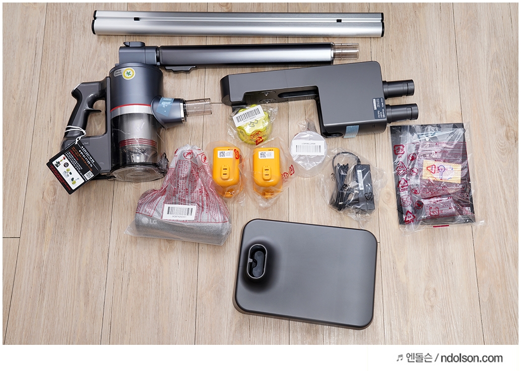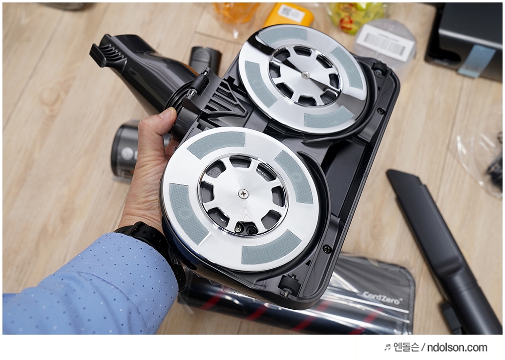 무선청소기의 가격대는 100만대로 프리미엄 청소기답게 청소를 위한 모든 청소도구가 담겨 있습니다. 무려 7가지의 청소 흡입 도구들을 이용하여 침구류 청소부터 손이 닿지 않는 상단 청소나 가구들 틈새의 공간까지 청소할 있게 해 줍니다. 청소기의 롤 부분은 더욱 얇아져서 틈새 공략에 편해졌습니다.