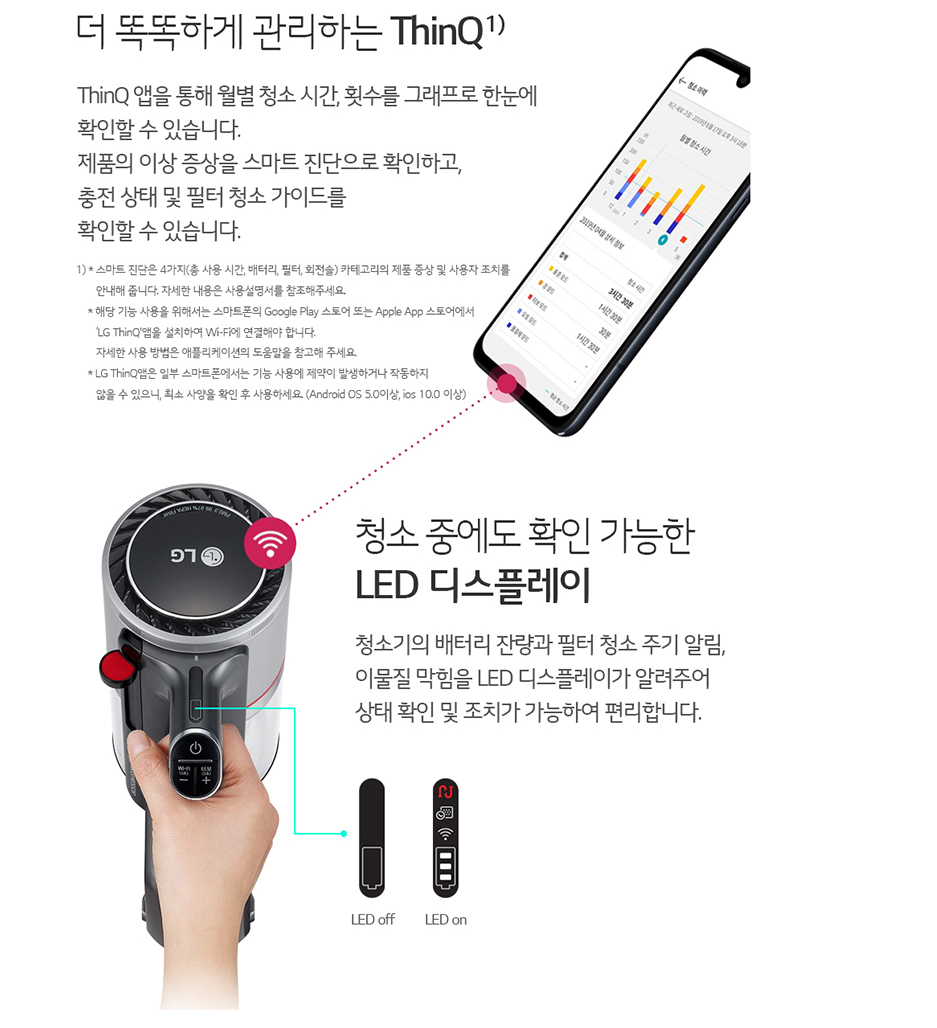 자세히 보면, LED 디스플레이로 바뀌면서 더 다양한 정보를 보여주게 바뀌었습니다. 배터리 잔량뿐 아니라 이물질 막힘이나 청소 주기 알람, 배터리 잔량을 표시해줍니다.
