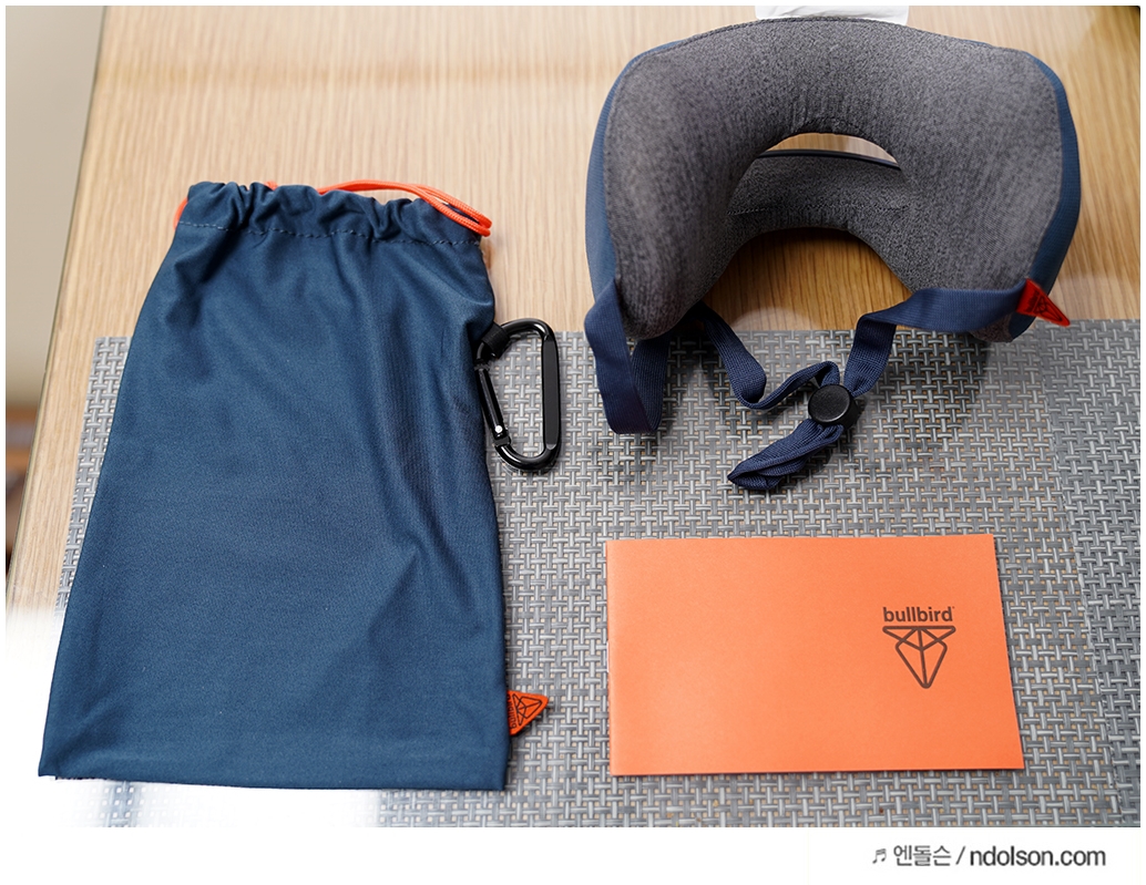 불버드 목베개의 구성품입니다. 휴대용 파우치와 매뉴얼이 들어 있습니다.