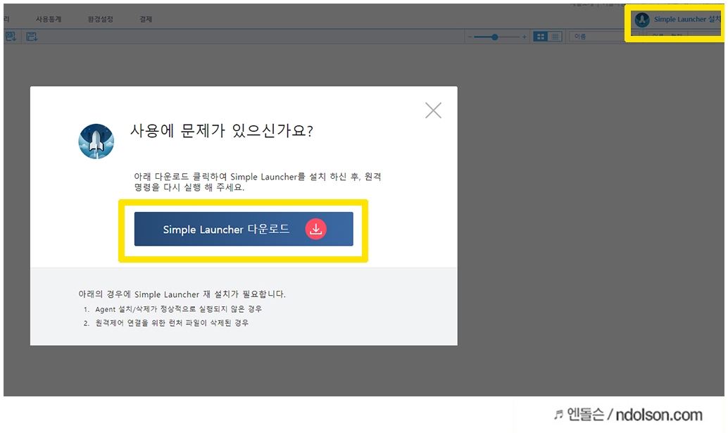 리모트뷰 사용법은 간단합니다. 관리계정으로 로그인 후, 원격 조정하고 싶은 PC에 Simple 런처를 설치해주면 됩니다. 우측 상단에 심플런처를 다운로드하고 설치합니다.