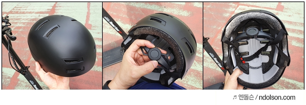 아이나비 스포츠 헬멧입니다. 상단에는 통풍구가 있어 시원합니다. 또 복잡하지 않게 머리 사이즈를 조정하게 다이얼 방식으로 되어 있어 돌리면 크기 조정이 가능합니다. 두꺼운 쿠션감도 좋았습니다. 무지의 블랙 전동킥보드 전용 헬멧입니다. 헬멧 미착용하면 벌금 10만원!