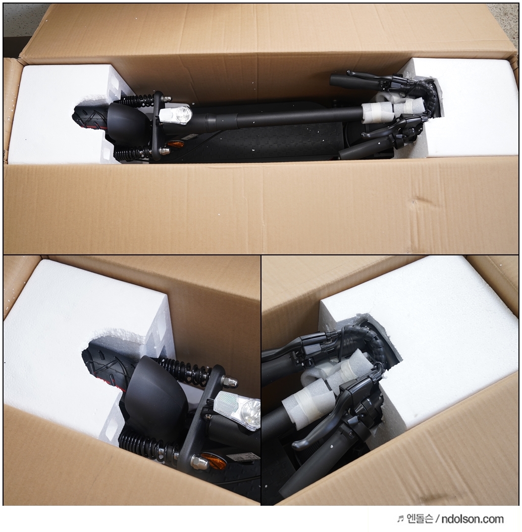 정말 포장이 잘되어 있습니다. 전동킥보드는 배송 중 무개로 인해 고장 날 수도 있기 때문에 고정을 잘해두었네요.