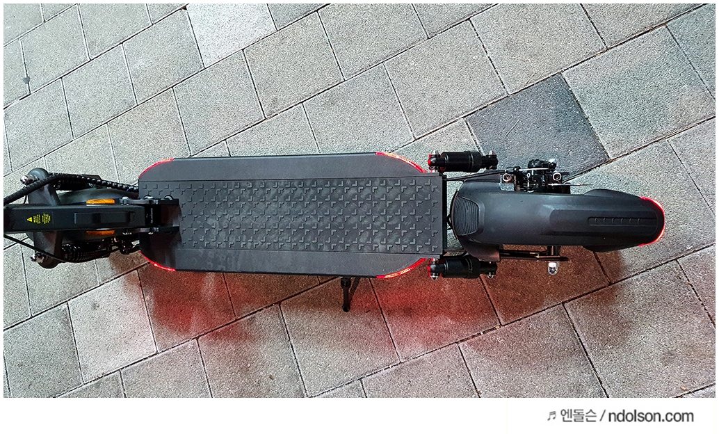 전동킥보드를 구매할 때 발판이 매우 중요한데, 발판이 고무 재질로 되어 미끄러지지 않게 되어 있습니다. 또 21.5cm로 넓기 때문에 불안하지 않습니다. 무조건 넓은 게 편합니다.