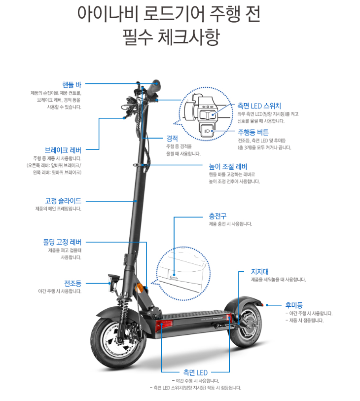 전면 및 후면, 좌우 4개 LED까지 야간 주행 시에도 안전을 위한 장치가 다수 부착되어 있습니다.