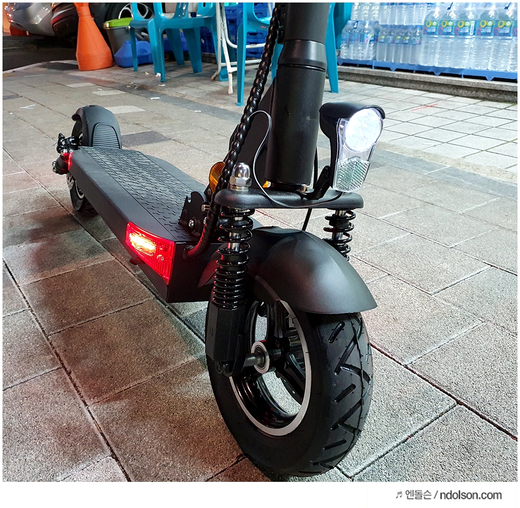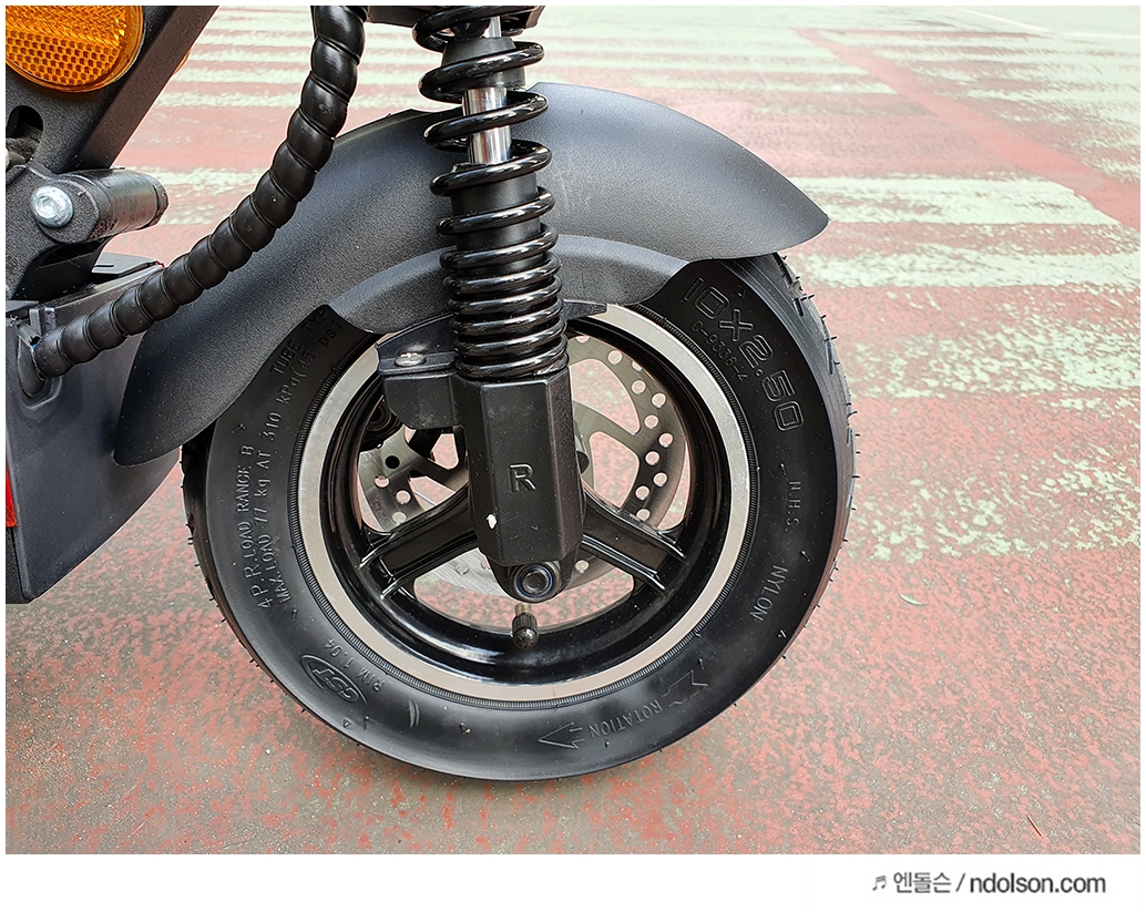 전면의 서스펜스가 장난 아닙니다. 지면의 충격을 완화하기 때문에 전동킥보드를 구매할 때 서스펜스를 지원하는 모델이 좋습니다.