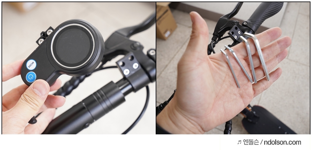 배송의 편의성을 위해서 전동킥보드 컨트롤 부분이 분리되어 배송되는데요. 같이 들어 있던 육각모 공구로 돌려주면 고정할 수 있습니다.