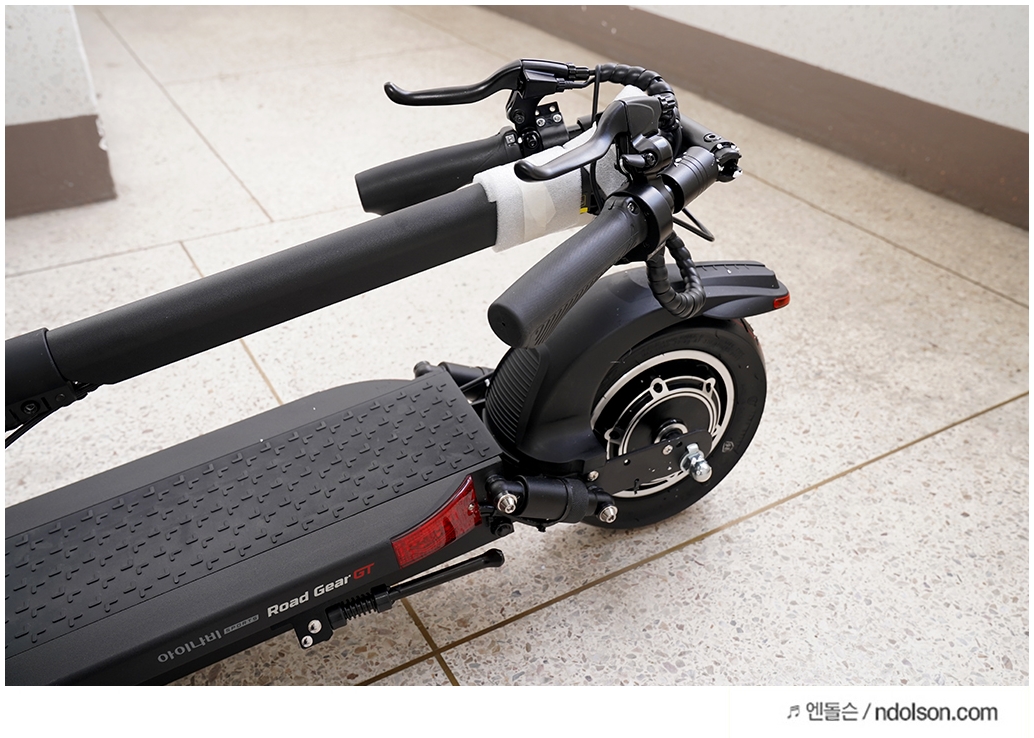 아이나비 스포츠 로드기어 GT는 접이식 전동킥보드로 핸들부분이 완전히 접힙니다. 이런 방식은 수납공간의 적게 차지하고 자동차 트렁크에 넣기도 편리합니다.