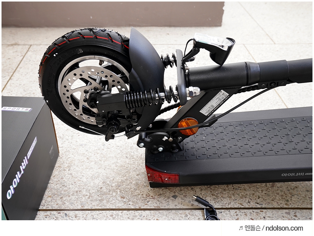 후면에도 서스펜스가 탑재되어 있습니다. 충격을 완화하기 때문에 좋습니다. 또 타이어는 공기 주입식이라 날카로운 곳에 찔리면 터질 수도 있지만, 대신 쿠션감이 더 좋습니다.