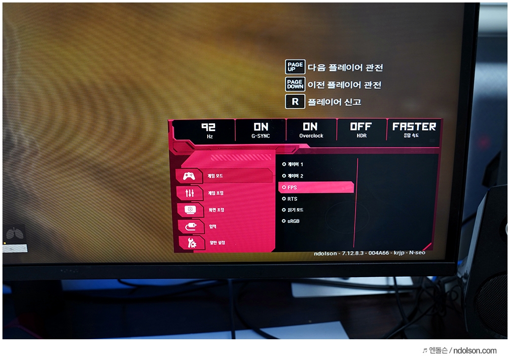 게임모드는 게이머 1/2, FPS, RTS, 읽기 모드, sRGB가 있습니다. 빠른 조작을 위해 조이스틱 같은 모니터 버튼을 누르고 밑으로 내려 빠르게 변경할 수 있습니다.