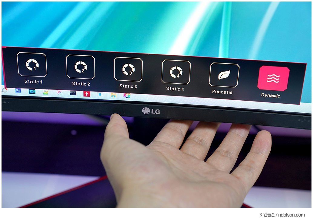 LG 모니터는 전면은 조작 버튼 없이 깔끔합니다. 조작 버튼은 하단에 있는 데, 조이스틱 같은 버튼으로 되어 있는 스틱과 돌리는 다이얼로 구성되어 있습니다.