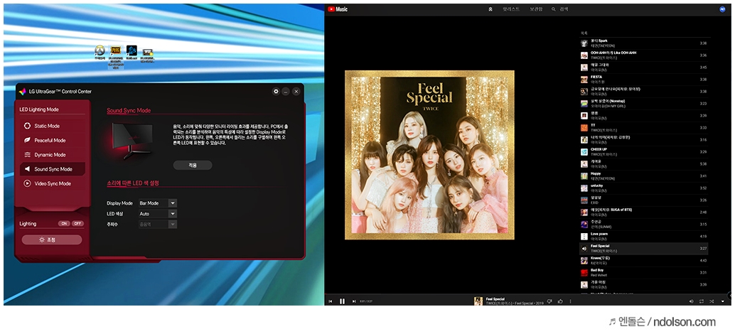 LG 울트라기어 모니터의 뒷면에는 2세대 라이팅이 탑재되어 있습니다. 울트라기어 콘트롤센터(LGUltraGearControlCenter)를 설치 후, 사운드 싱크를 통해 음악을 즐길 때 재생되는 소리에 맞춰 라이팅이 반응하게 할 수 있습니다. 비트에 따라 반응하는 게 멋지네요!