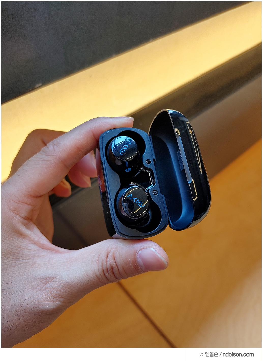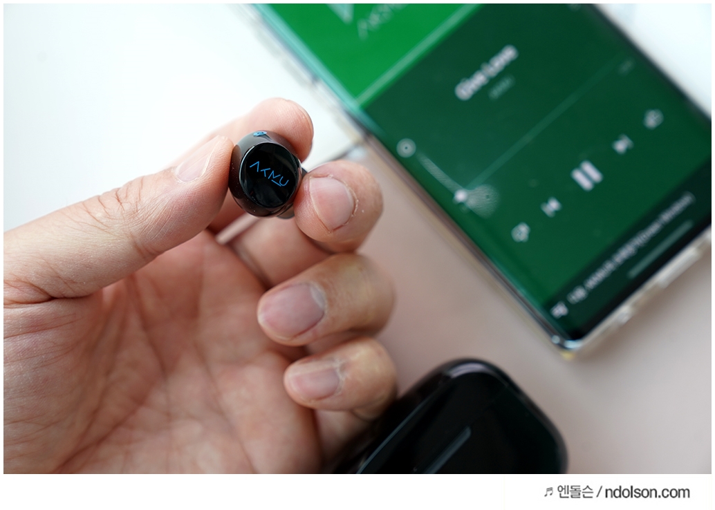 개인적으로 AKMU (악뮤) 라고 각인된 문구가 눈에 계속 들어옵니다. 무선 이어폰의 전체적인 외형은 날렵하기보다는 충분한 사이즈와 그립감을 가지고 있다고 이야기하고 싶습니다.
