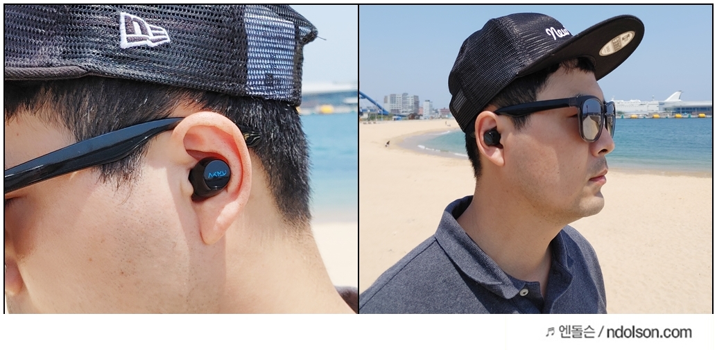 착용감도 좋지만, 착용 시 매번 블루투스 연동 시 악동뮤지션 수현의 안내멘트를 들어 볼 수 있습니다. 이어폰의 올바른 착용 방향은 AKMU의 문구가 정방향으로 되어야 합니다. 커널 이어폰으로 ANC가 아니지만 주변 소음이 적게 들려 음악 감상에 충분한 차폐감을 느낄 수 있습니다.
