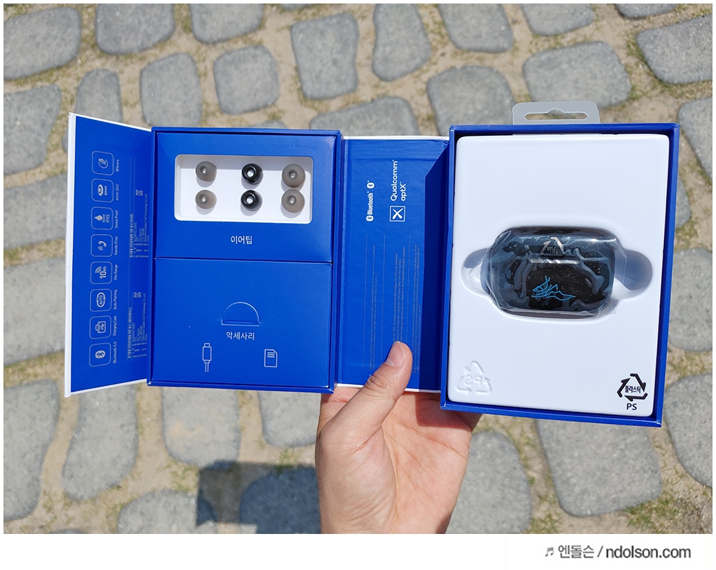 내부 패키지는 개별 포장과 함께 옆으로 열 수 있는 구조로 되어 있습니다. 스크래치에 민감하신 분을 위해 비닐로 개별 포장되어 있습니다. 또 기본 이어팁 이외에 3가지를 추가로 제공합니다. 메모리 팁을 통해서 운동 등의 다이나믹한 활동 시에도 귀에서 빠지지 않게 사용할 수 있습니다.