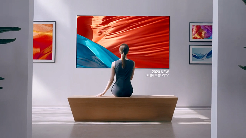이 TV는 2020년 새롭게 선보이는 <LG 올레드 갤러리 TV>로, 바로 ‘갤러리 디자인’을 선보이는 모델입니다. TV 하나에 화면 구동부, 스피커, 설치를 위한 브라켓까지 담아 별도 외부 본체 없는 일체형 디자인입니다. 또 제품 뒷면도 평평하여 벽지처럼 얇습니다. 덕분에 CF처럼 그림같이 벽면에 설치가 가능합니다.