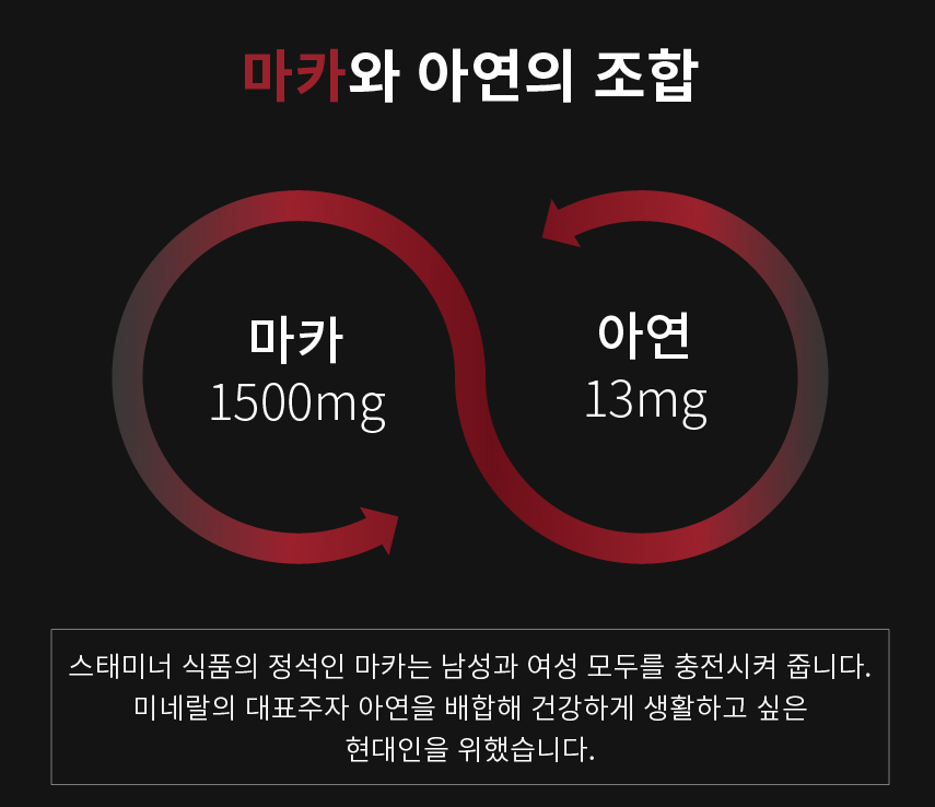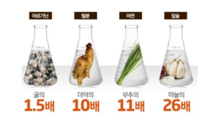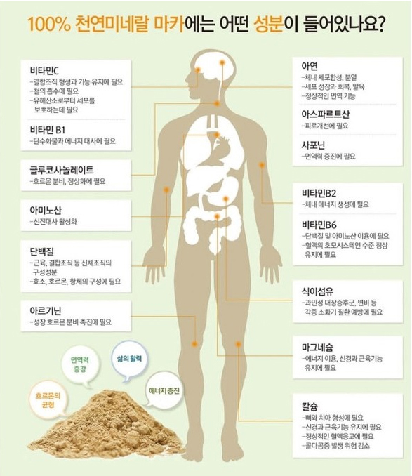 마카의 효능은 굴의 1.5배, 더덕의 10배, 부추의 11배, 마늘의 26배 아르가닌, 철분, 아연, 칼슘을 갖추었습니다.