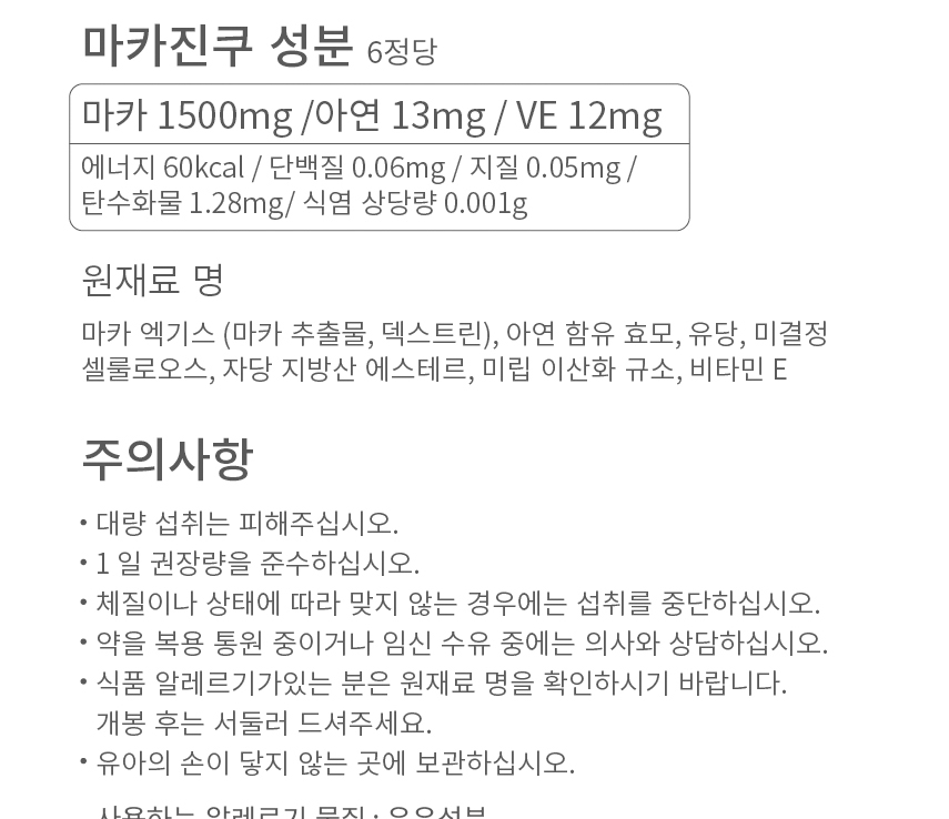 마카진쿠는 마카 1500mg, 아연 13mg, VE 12mg를 가지고 있습니다. 매일 꾸준히 먹으면 효과를 볼 수 있습니다. 1+1으로 2통이니 두달 먹어보고 이야기하겠지만, 무언가 챙겨 먹어야 한다는 생각에 찾아본 마카가 효과가 조금 있는 느낌입니다.