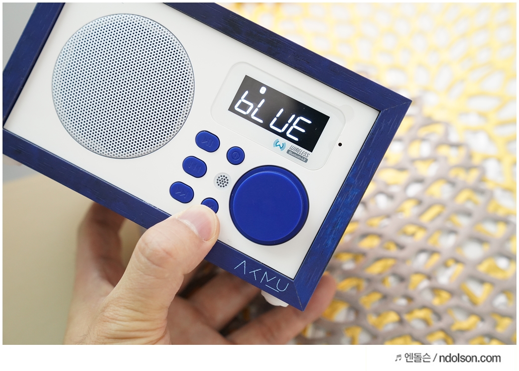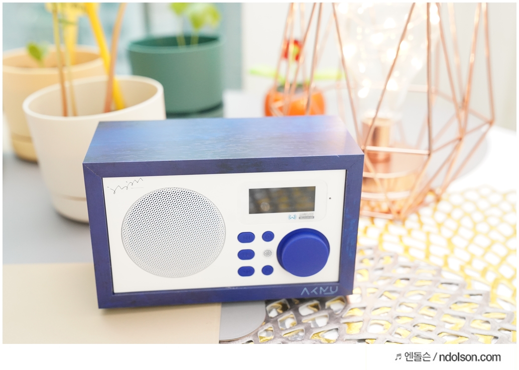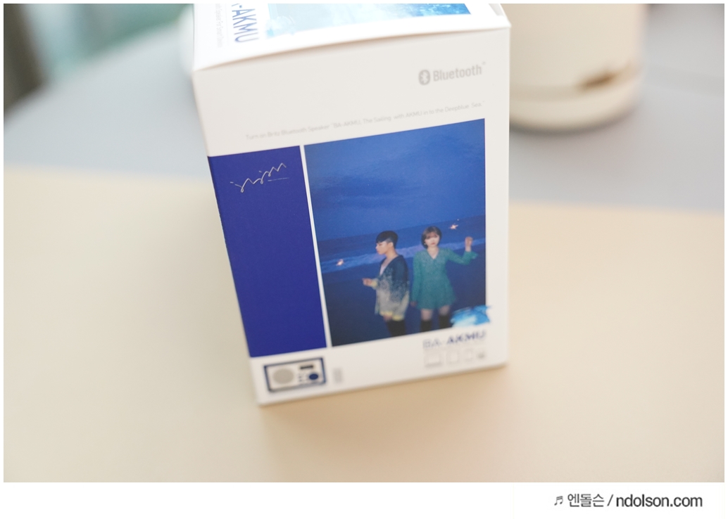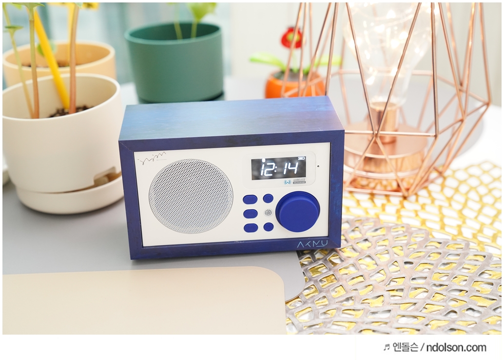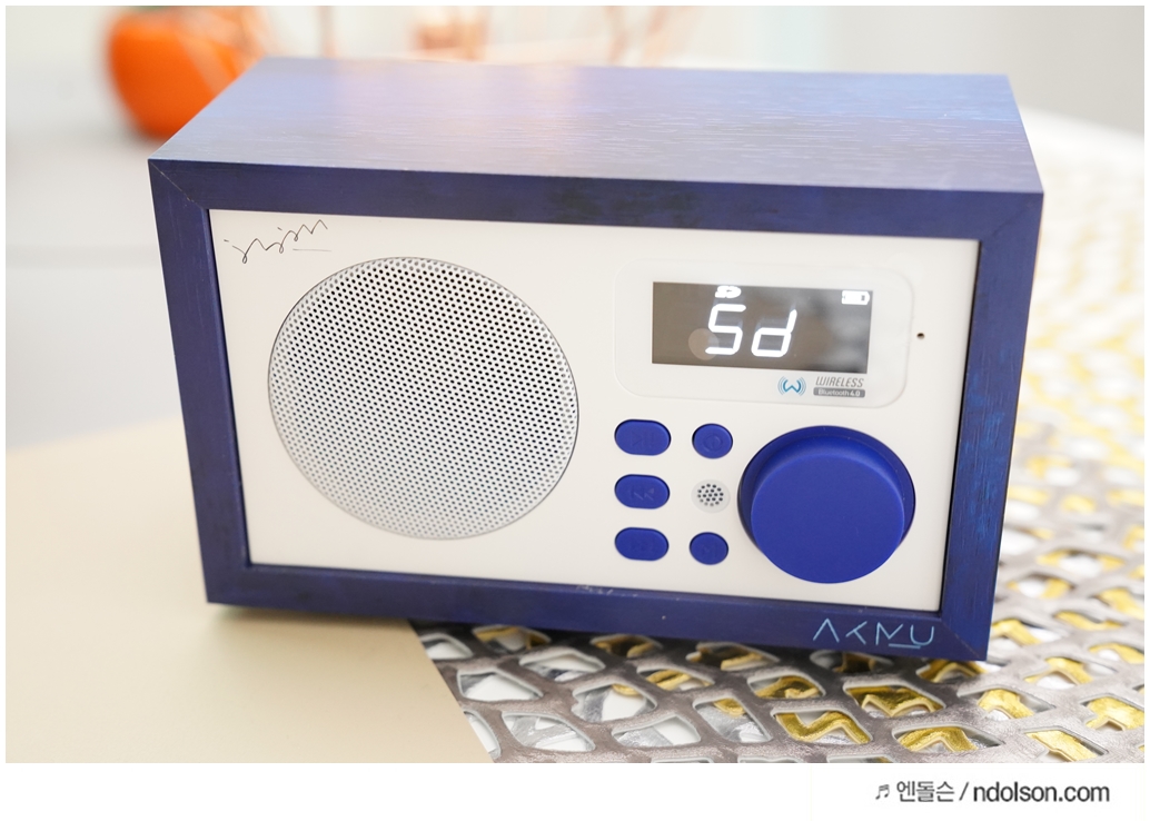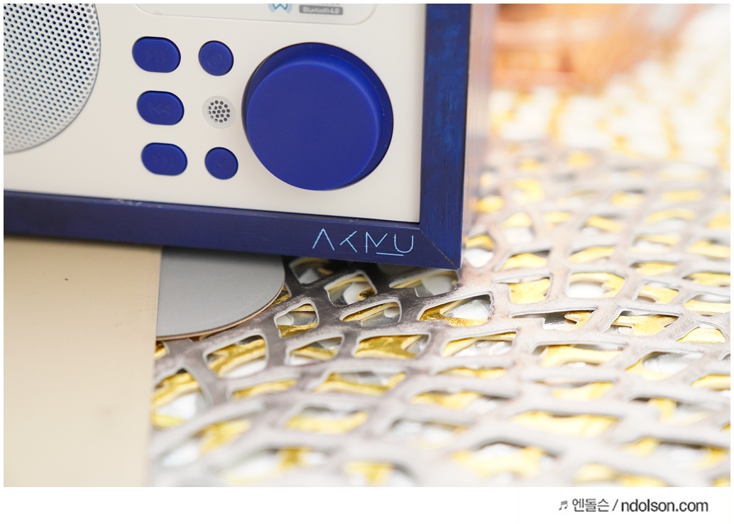 화이트에 딥블루에 나무결까지 살아있고, AKMU(악뮤) 문구와 싸인을 볼 수 있었습니다. 탁상용 인테리어 스피커로 제격입니다.