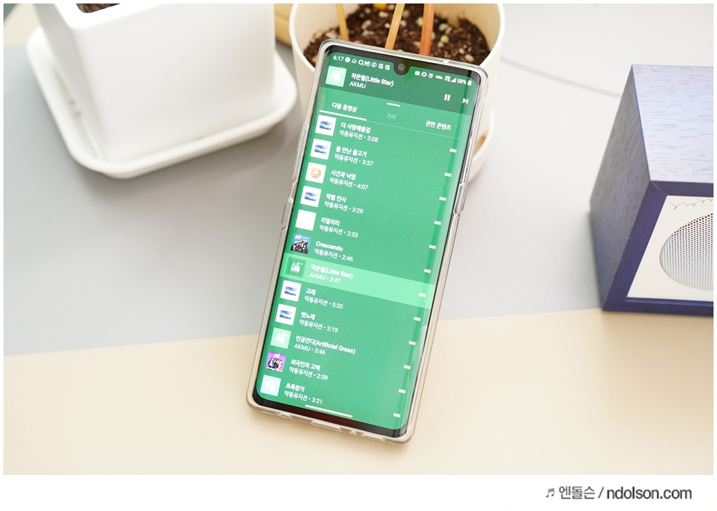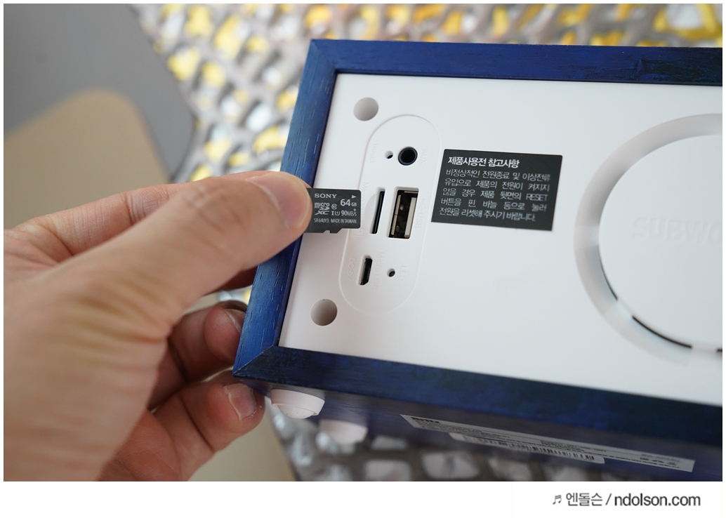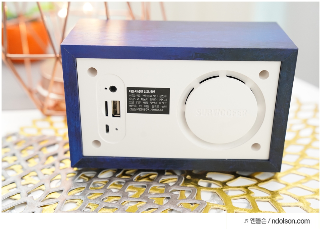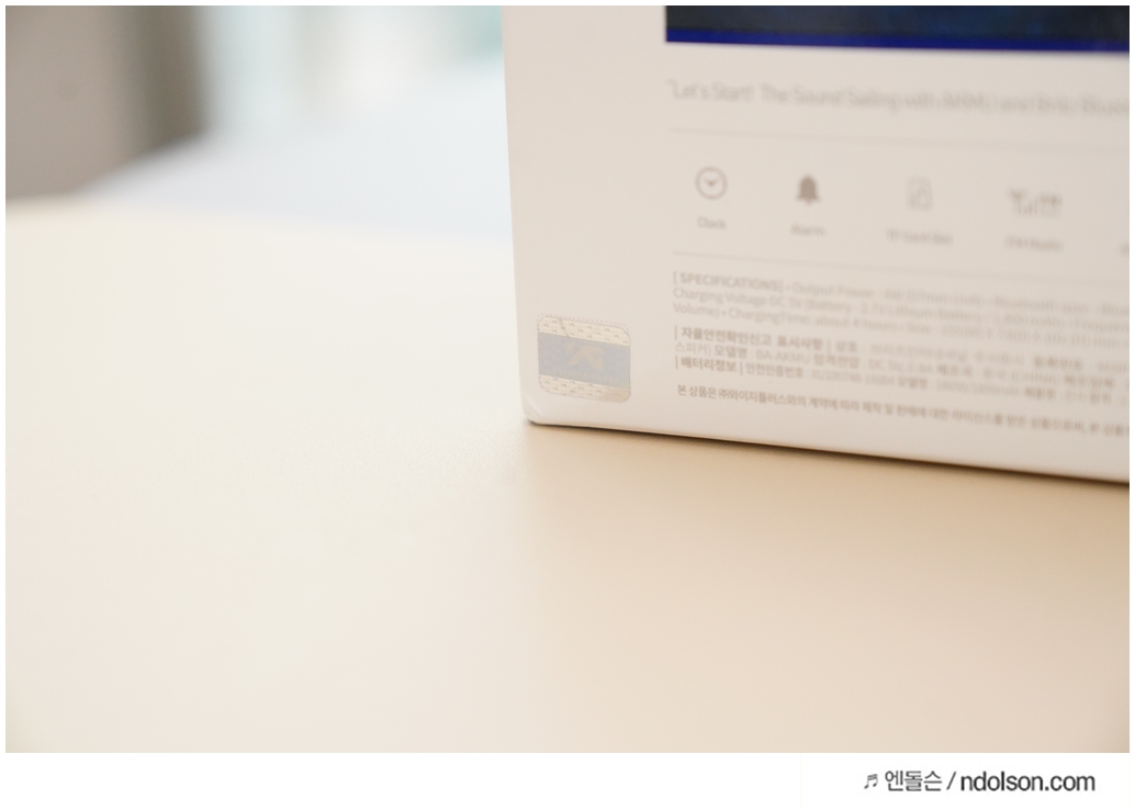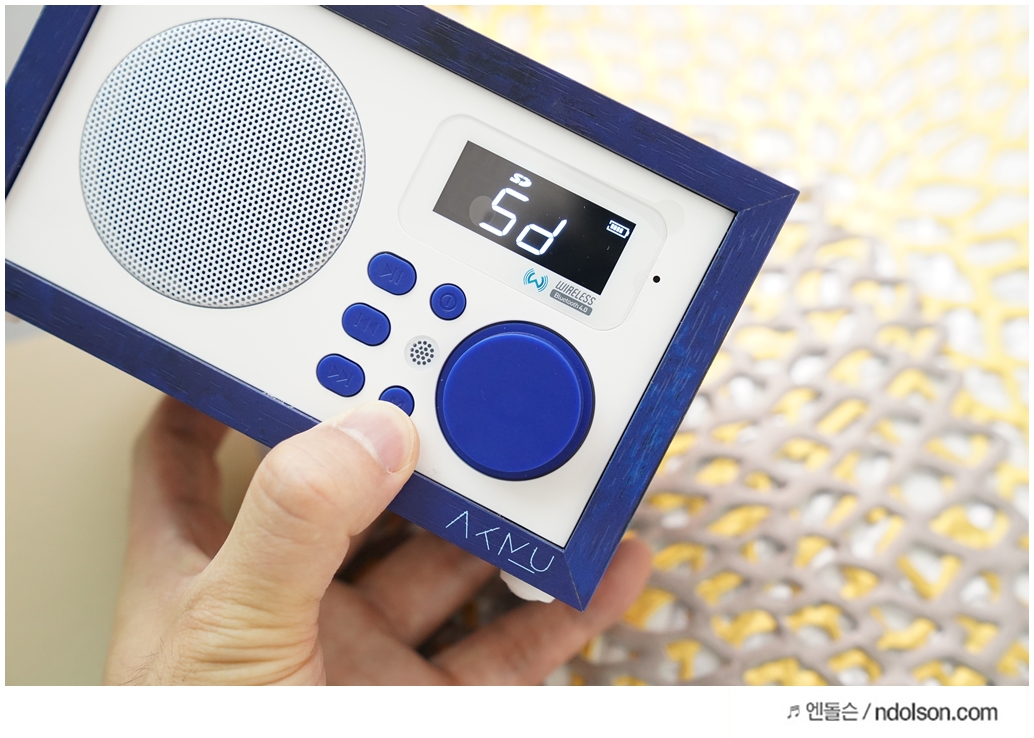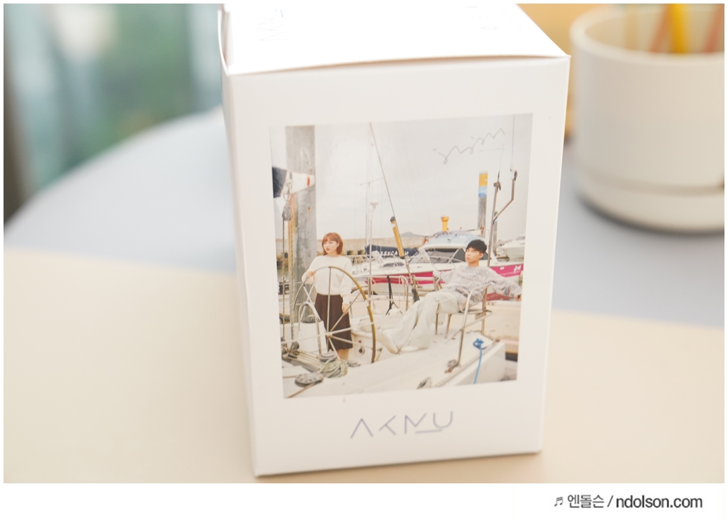 화이트에 딥블루에 나무결까지 살아있고, AKMU(악뮤) 문구와 싸인을 볼 수 있었습니다. 탁상용 인테리어 스피커로 제격입니다.