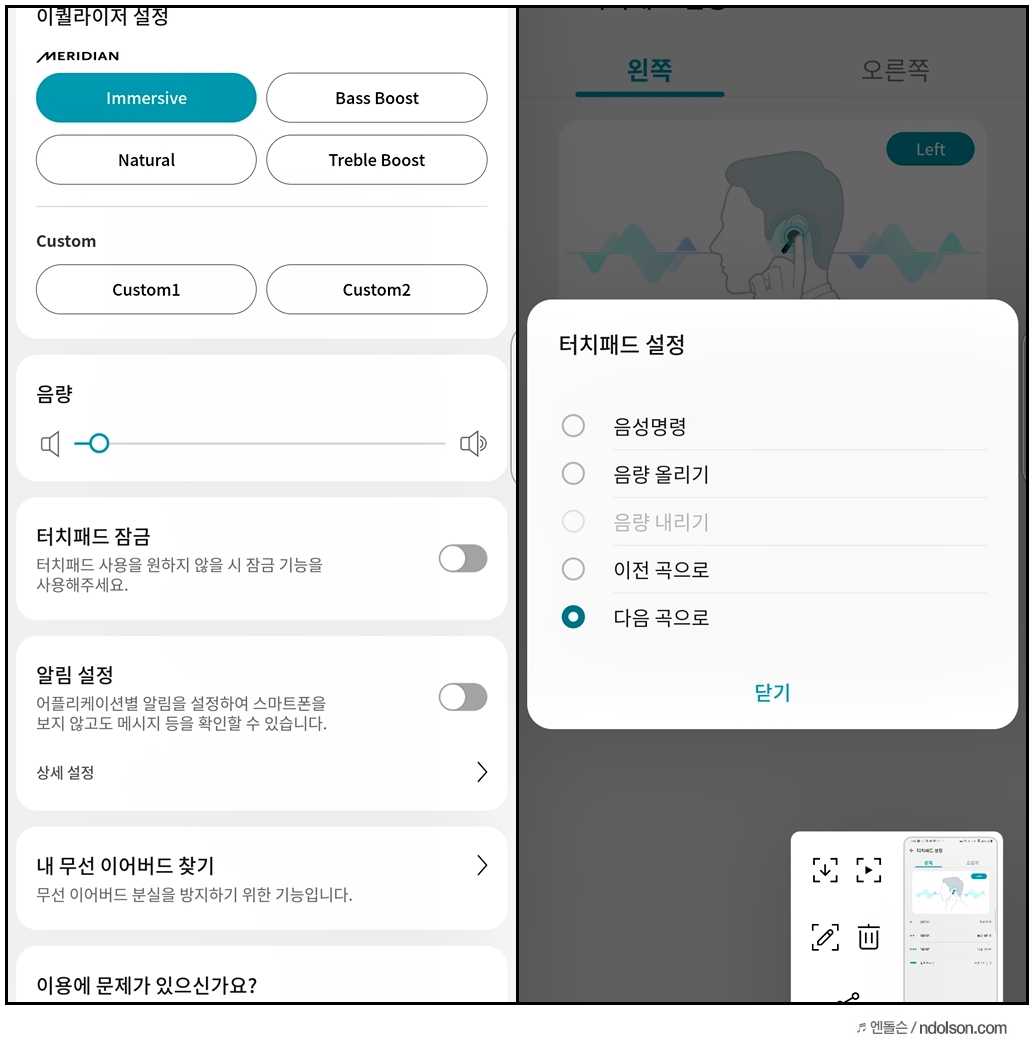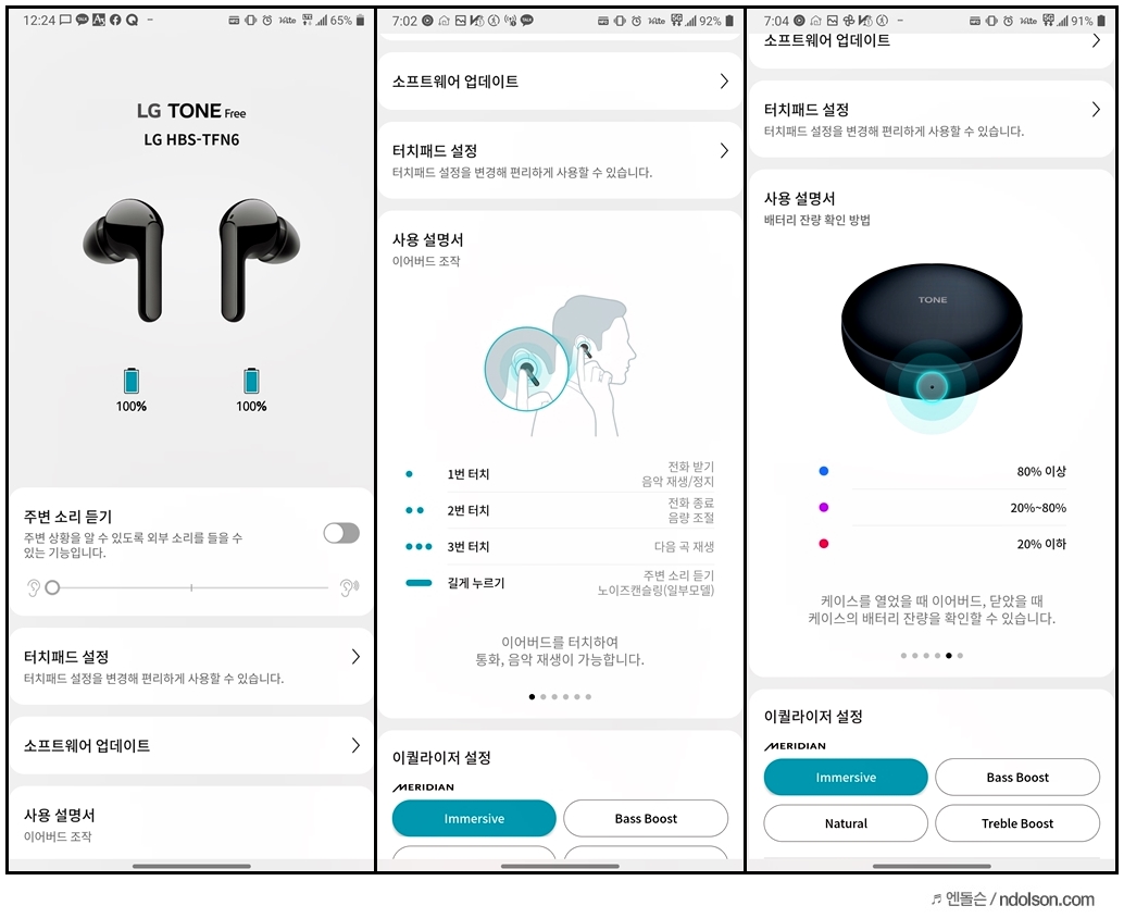 싼 이어폰부터 비싼 이어폰까지 청음 해본 입장에서 EQ 기능은 음악을 더욱 풍성하게 듣게 해 줍니다. LG 톤 프리가 중저음의 힘 있는 음색을 보여주는 데, 여기에 Immersive(이머씨브), Natural(내츄럴), Bass Boost(베이스 부스트), Treble Boost(트레블 부스트)와 커스텀마이징이 가능합니다.