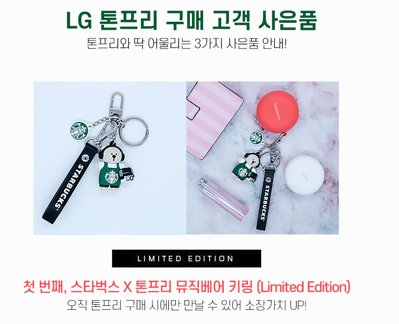 사전예약 기간인 ~7월 16일이내에 구매하시면, 스타벅스 X 톤프리 뮤직베어 키링과 톤프리 전용 컬러인 민트, 파스타치오, 레몬, 스트로베리, 로즈마리로 칼라풀하게 즐길 수 있습니다. 또 무선충전이 지원되는 LG 톤 프리를 위한 귀여운 카카오프렌즈 무선 충전 마우스 패드도 증정해주고, 네이버N포인트 최대 7만으로 할인하여 구매할 수 있습니다.