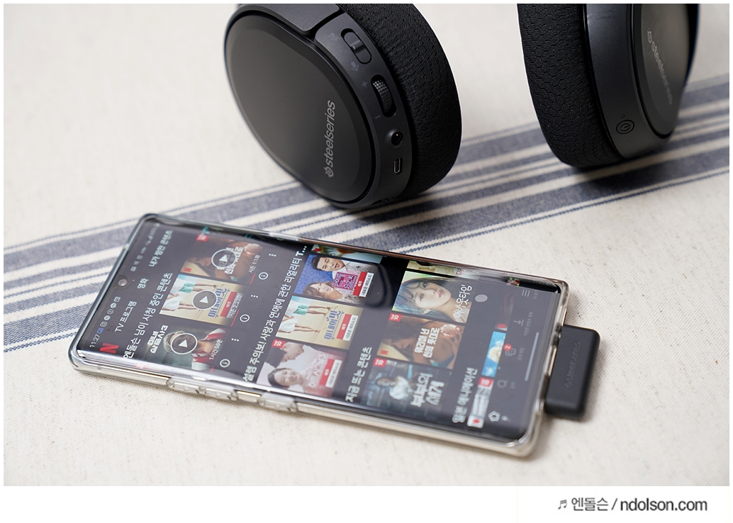 안드로이드 스마트폰에 무선 동글이를 연결하였습니다. 페어링 과정 없이 바로 음성이 수신되고 제어됩니다. 음질도 뛰어난 스틸시리즈 Arctis 1 wireless 은 영화, 음악 듣기도 좋고 스마트폰 게임하기도 좋습니다.