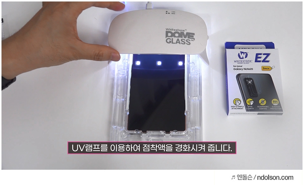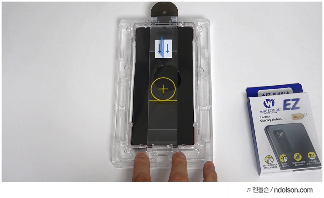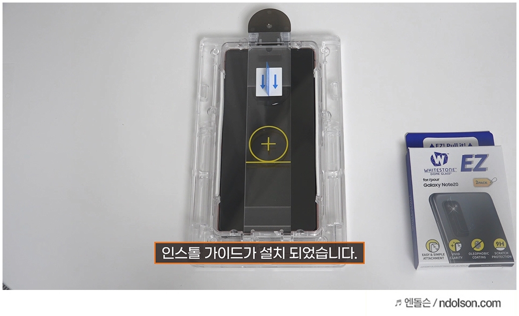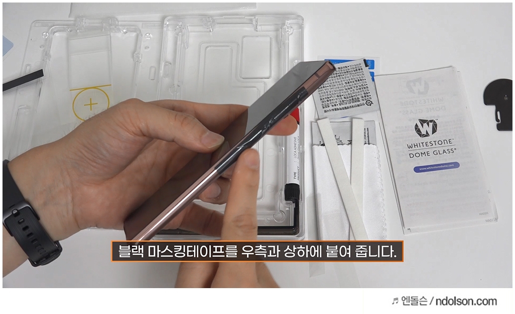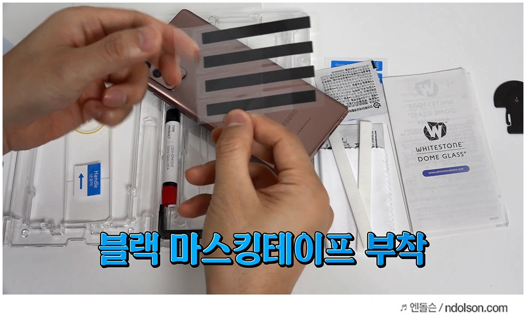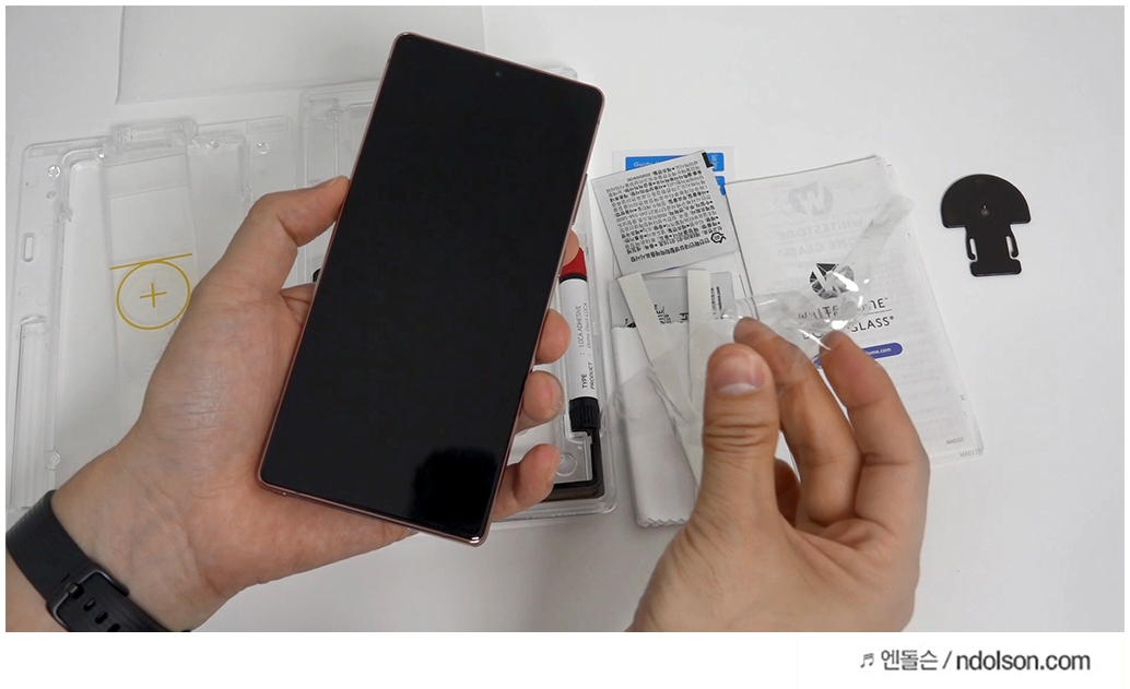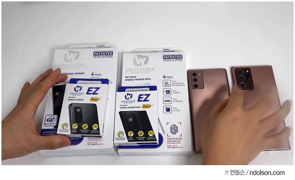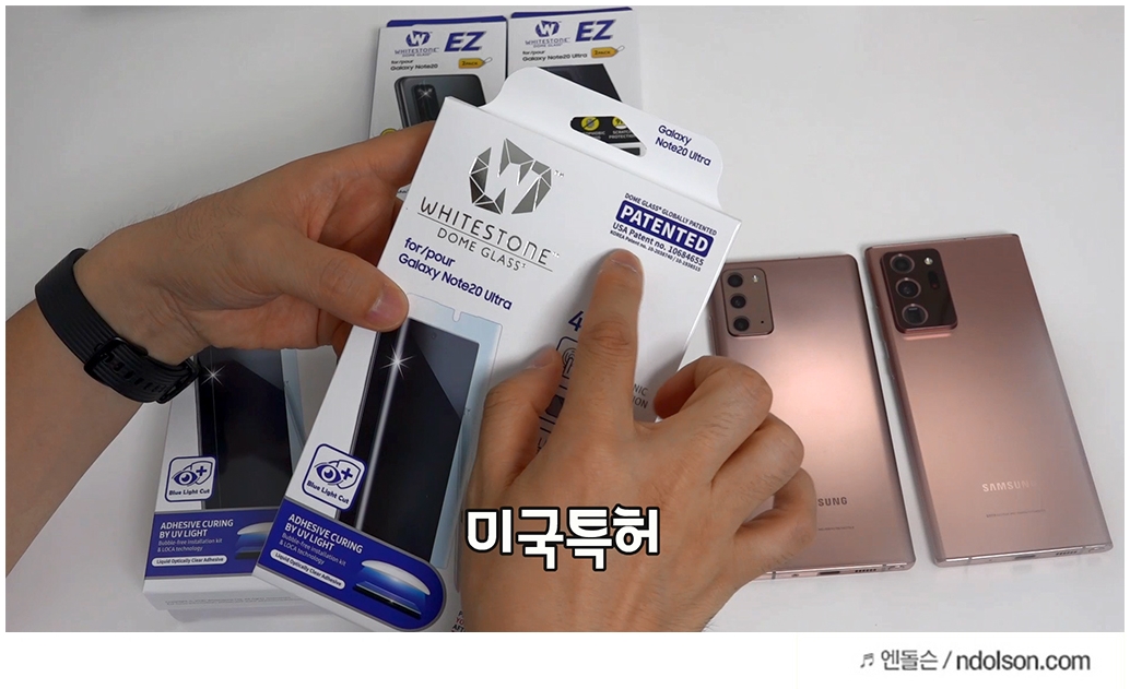 바로 화이트스톤에서 출시한 노트20 돔글라스를 부착하는 방법입니다. 전면, 후면 모두 강화유리 및 보호필름 부착할 수 있습니다. 또 삼성에서 인증한 강화유리이며, 미국 특허도 있습니다.