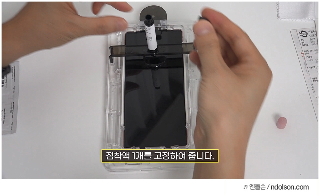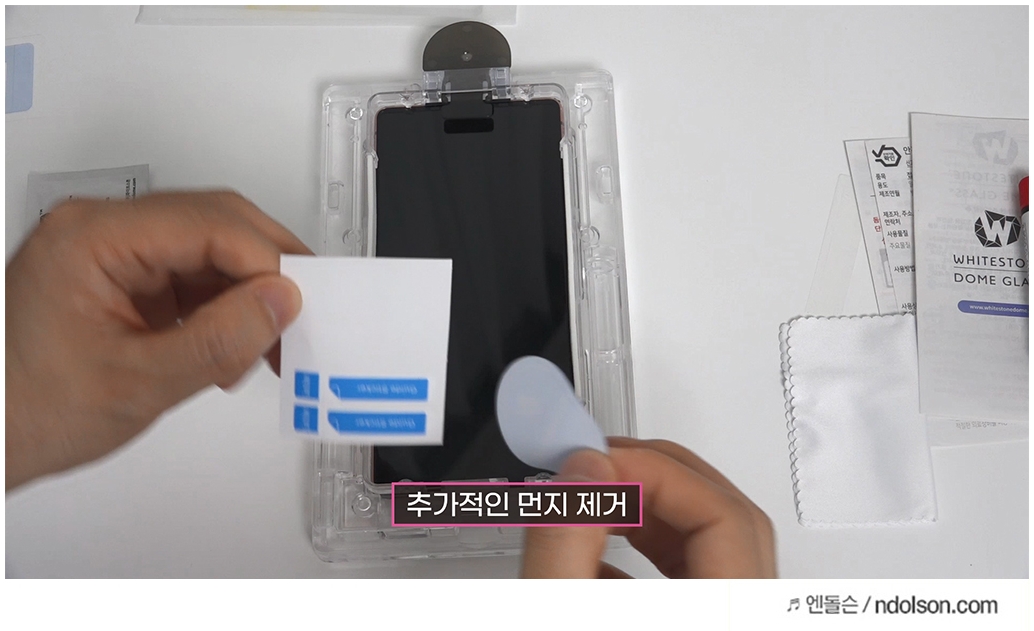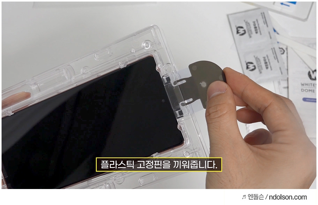 스마트폰을 하단 지그에 올려둡니다. 돔글라스는 셀프로 강화유리를 부착할 수 있게 틀위에 올려 두고 하는 방식인데요. 처음하는 초보자들도 틀위에 올려두면 스마트폰이 고정되어 쉽게 할 수 있는 장점이 있습니다.