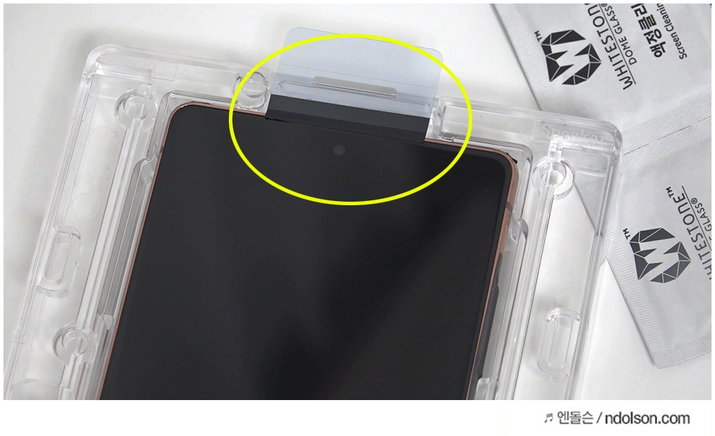 점착액이 강화유리와 노트20 디스플레이 사이를 모두 퍼져나갑니다. 이제 인스톨 가이드를 제거합니다. 손잡이를 잡고 빼주면 됩니다.