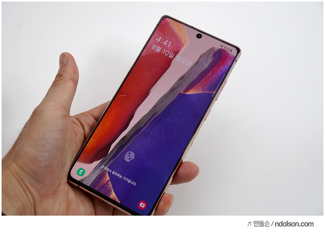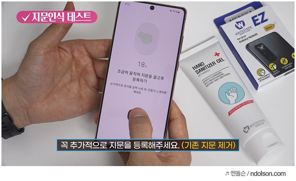 지문인식 테스트를 해보았는 데 잘 동작하네요. 하지만 노트20 강화유리를 부착 후, 지문인식률을 높이기 위해서는 기존 지문을 제거하고 다시 등록해줍니다. 또 동일 손가락이라도 여러개의 지문을 등록하면 보다 인식률을 높일 수 있습니다. 또 터치 민감도를 켜두면 빠르게 동작하기도 합니다.