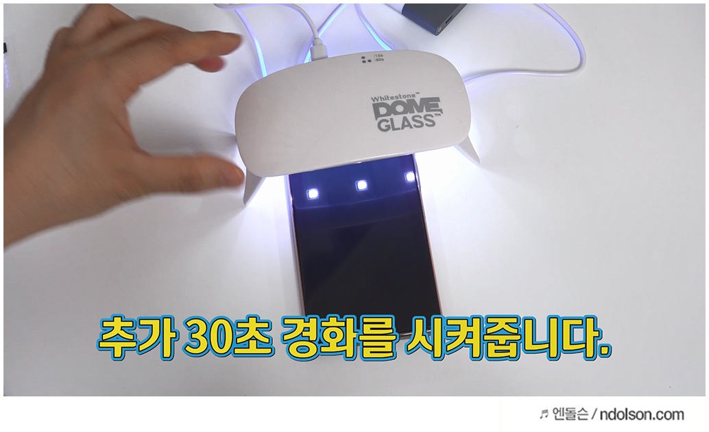 이제 UV램프로 경화를 시켜줍니다. 1번 누르면 15초, 2번 누르면 30초로 UV램프 경화기가 업그레이드 되었네요.