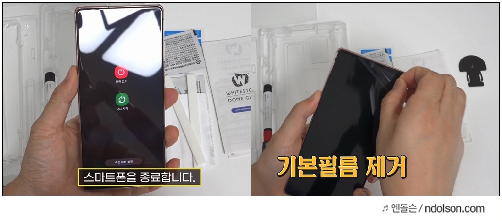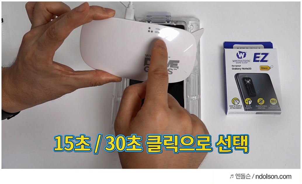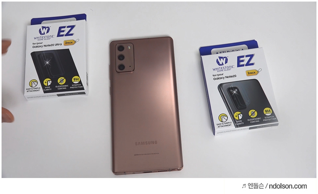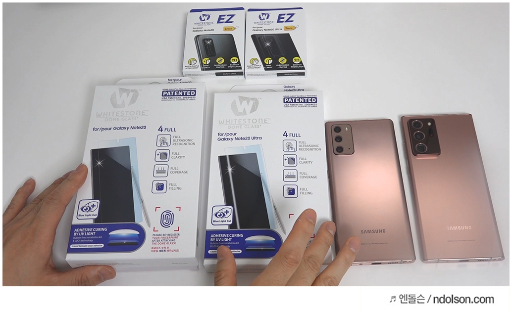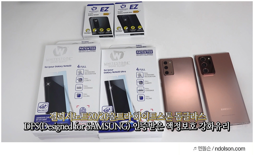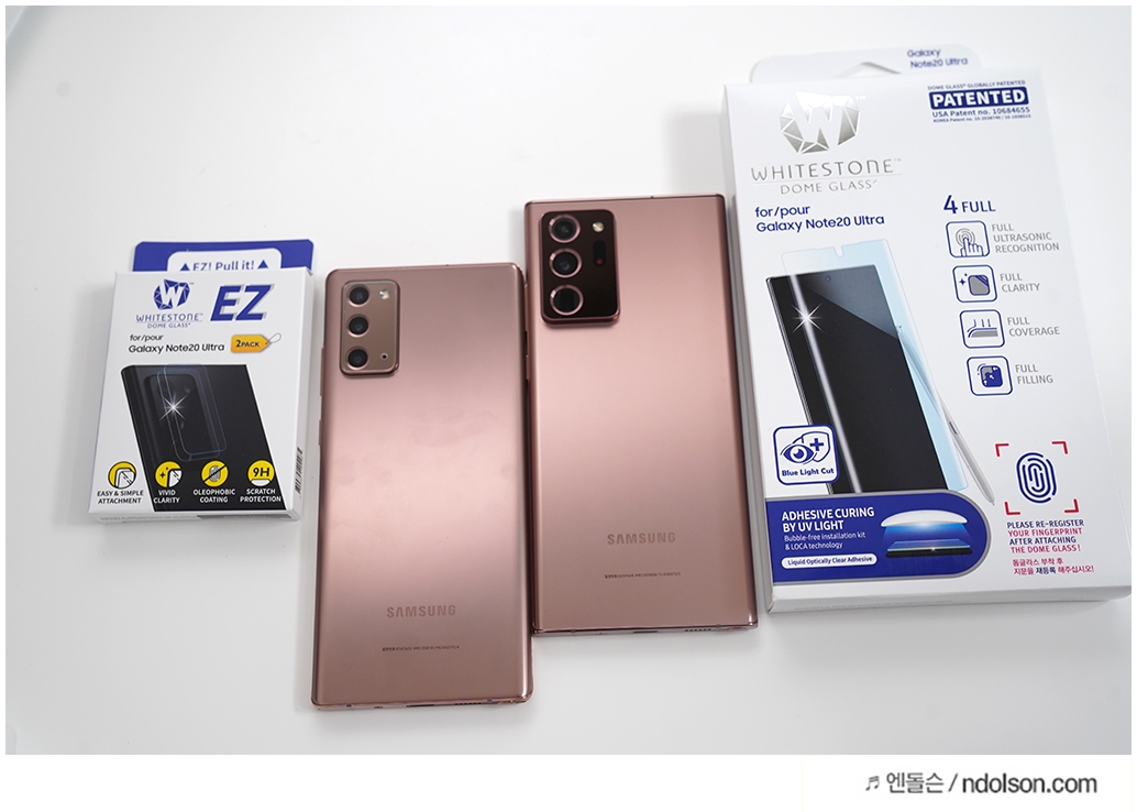 바로 화이트스톤에서 출시한 노트20 돔글라스를 부착하는 방법입니다. 전면, 후면 모두 강화유리 및 보호필름 부착할 수 있습니다. 또 삼성에서 인증한 강화유리이며, 미국 특허도 있습니다.