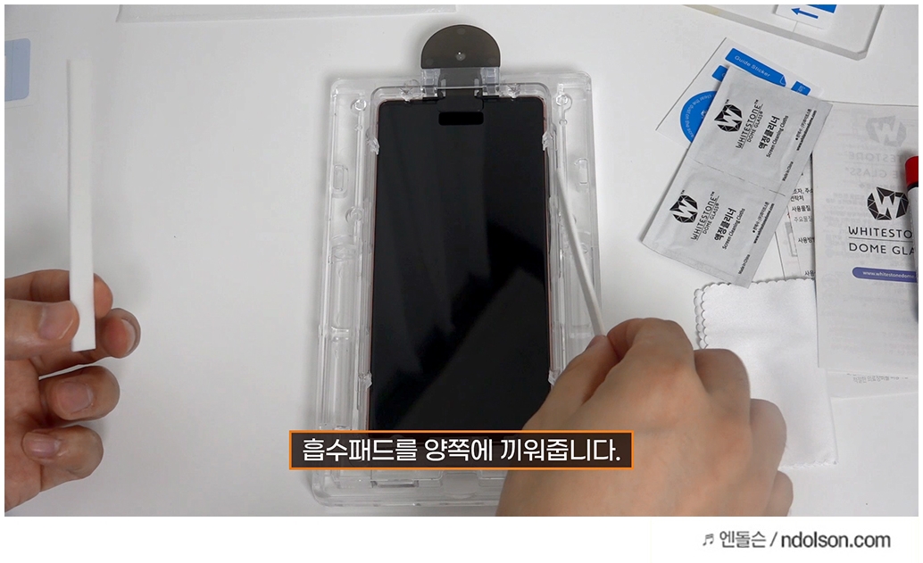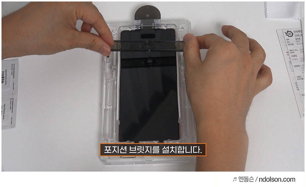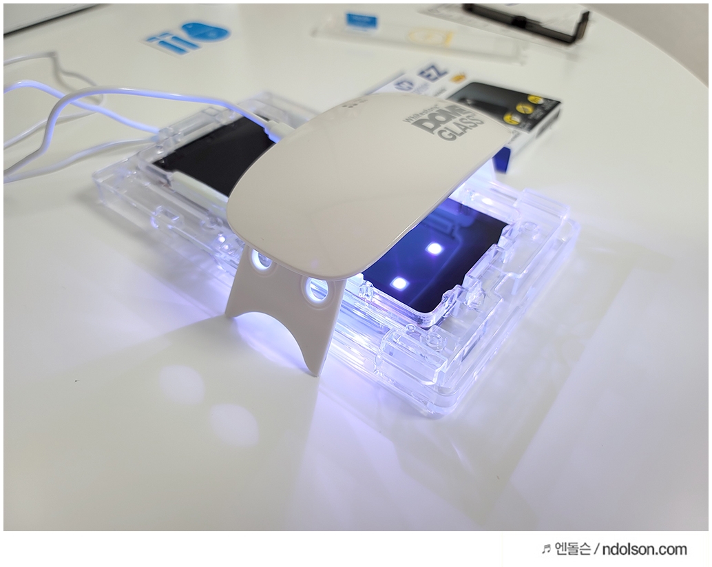 스마트폰을 하단 지그에 올려둡니다. 돔글라스는 셀프로 강화유리를 부착할 수 있게 틀위에 올려 두고 하는 방식인데요. 처음하는 초보자들도 틀위에 올려두면 스마트폰이 고정되어 쉽게 할 수 있는 장점이 있습니다.